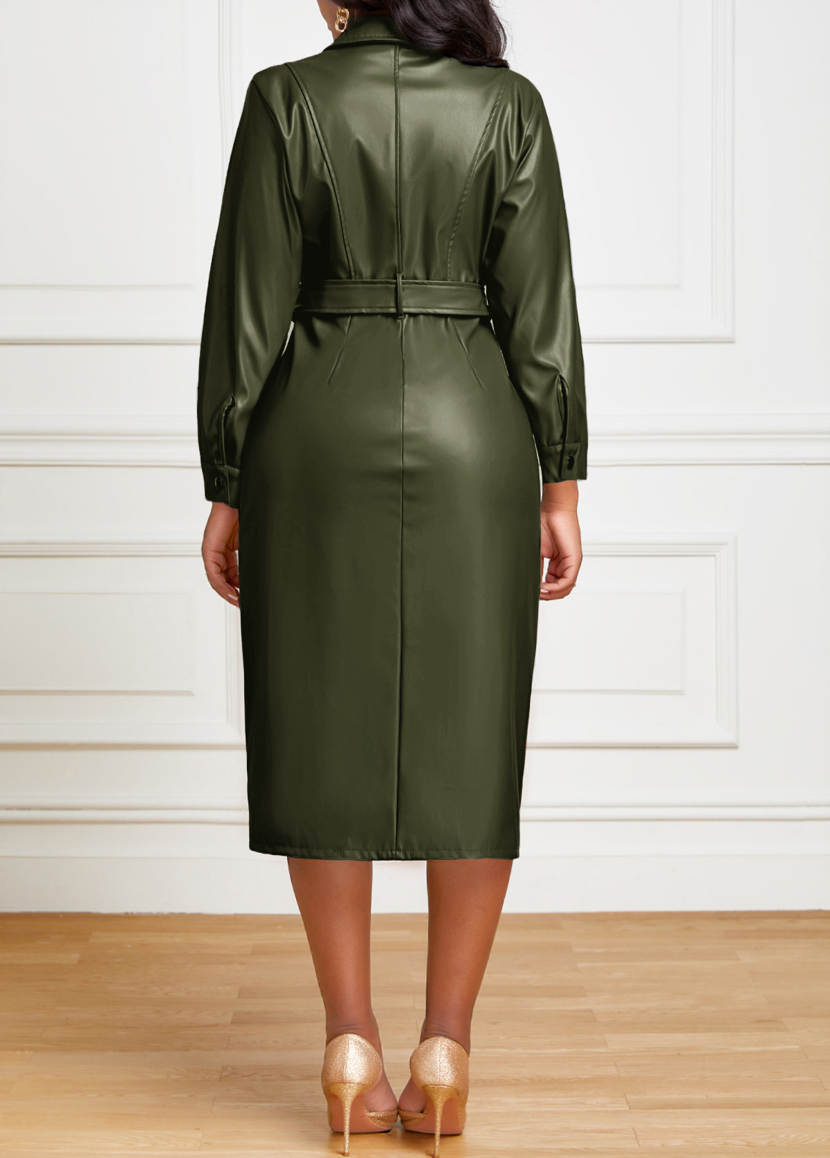 • Belted Faux Leather Snap Button Dress