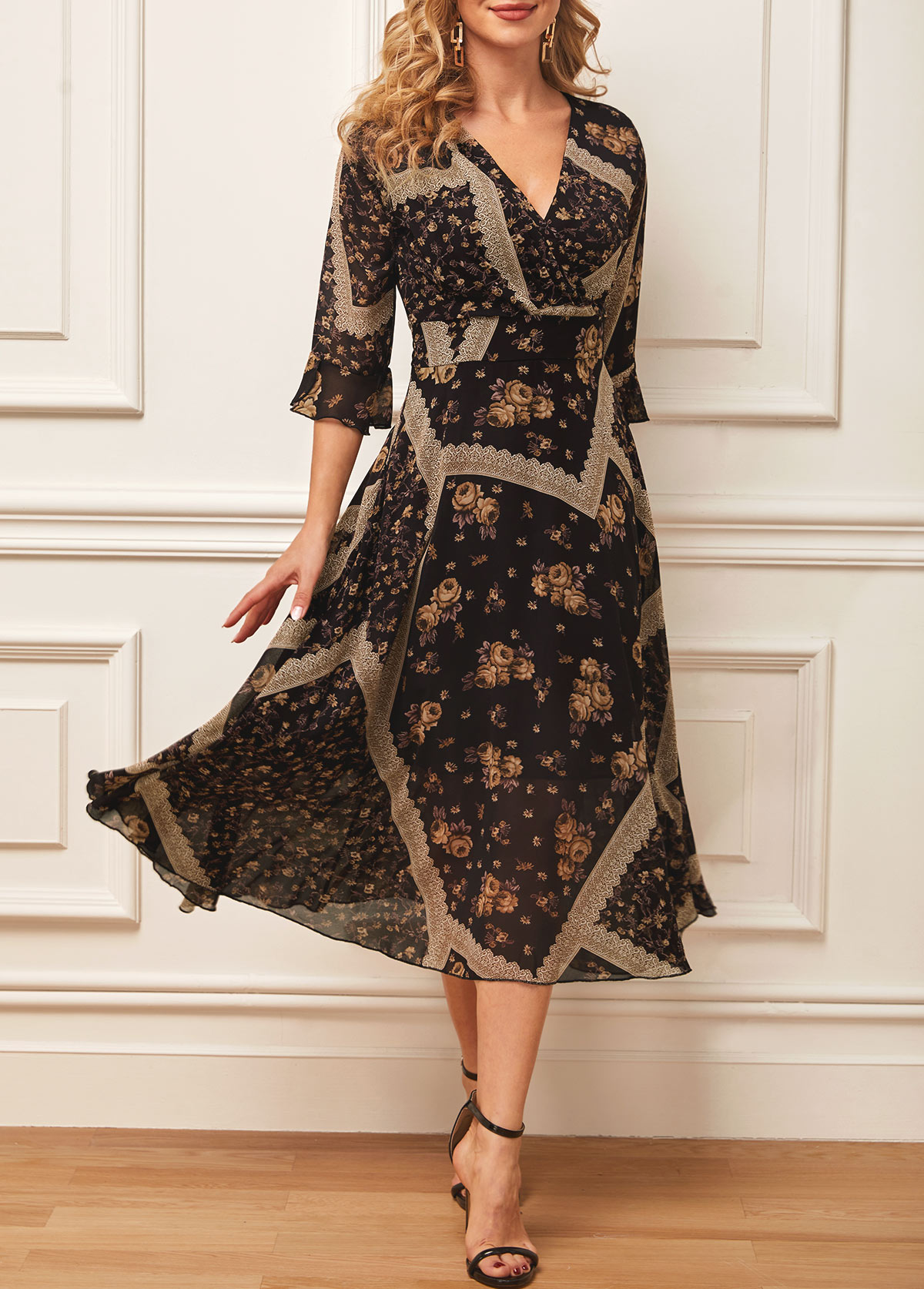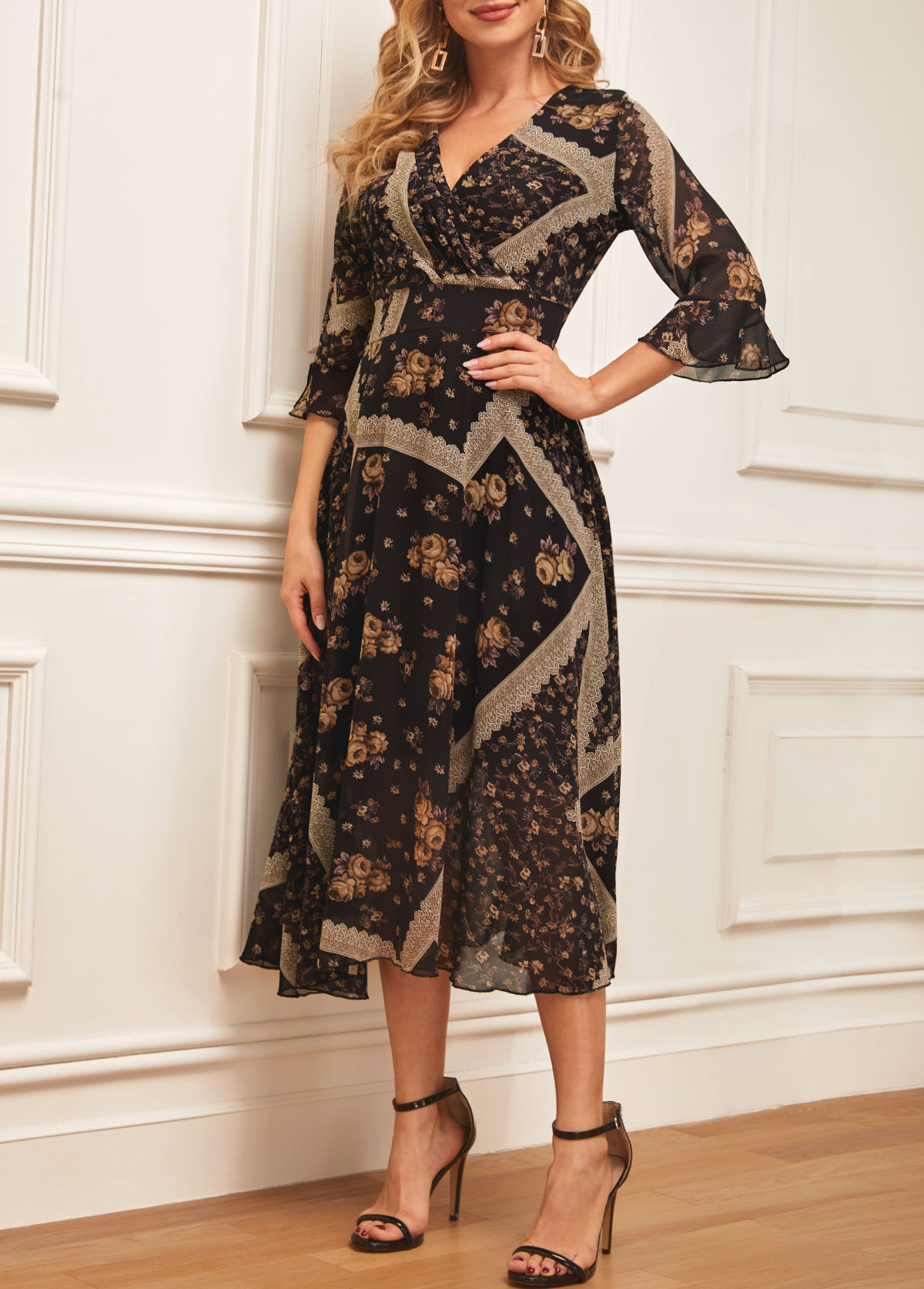 • Black Chiffon Floral Print V Neck Dress