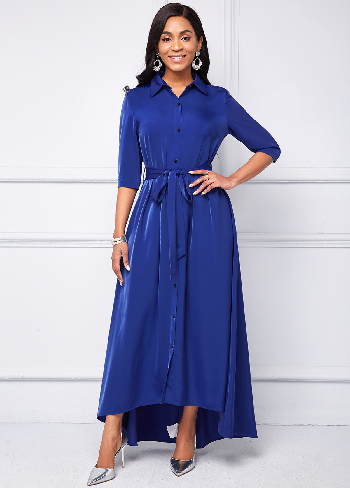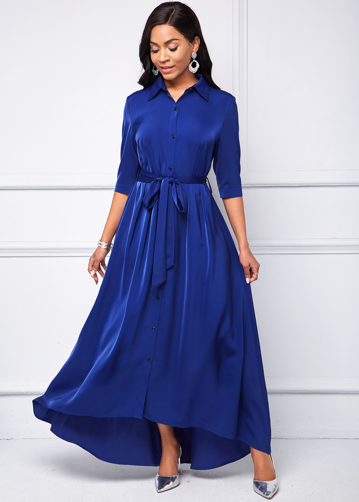 • Button Up Turndown Collar Belted High Low Dress