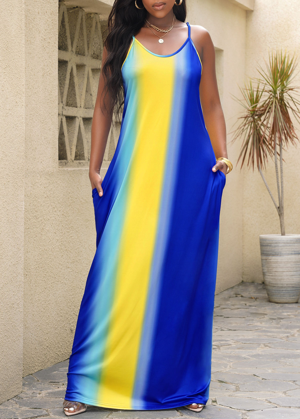 • Double Side Pockets Striped Blue Sleeveless Dress