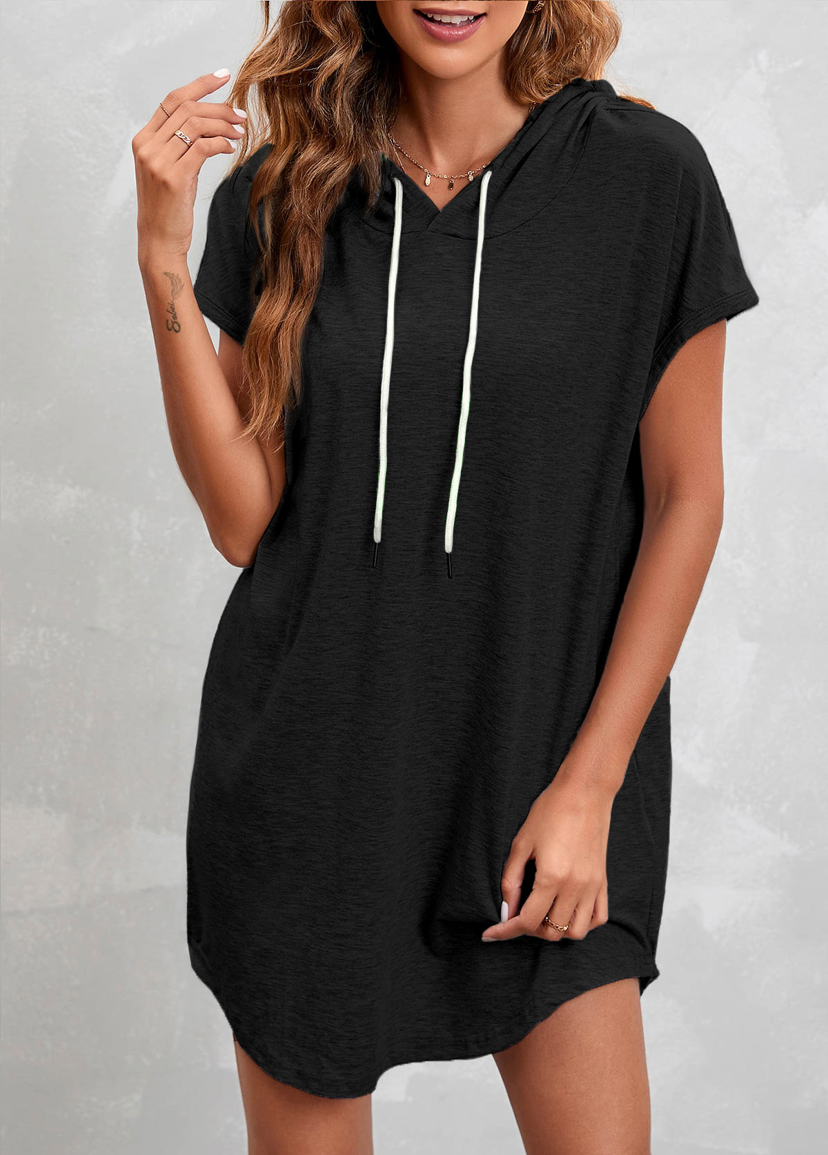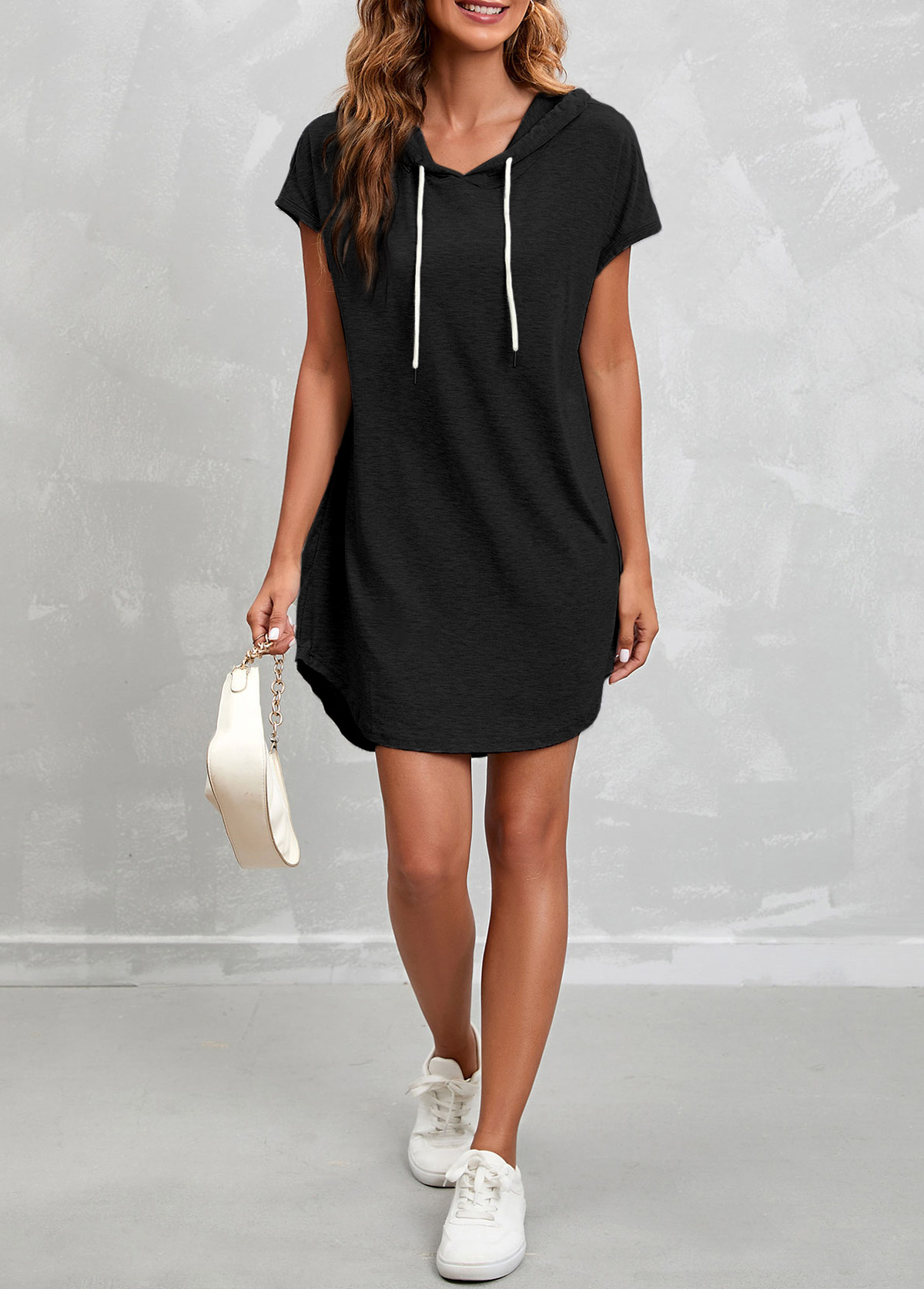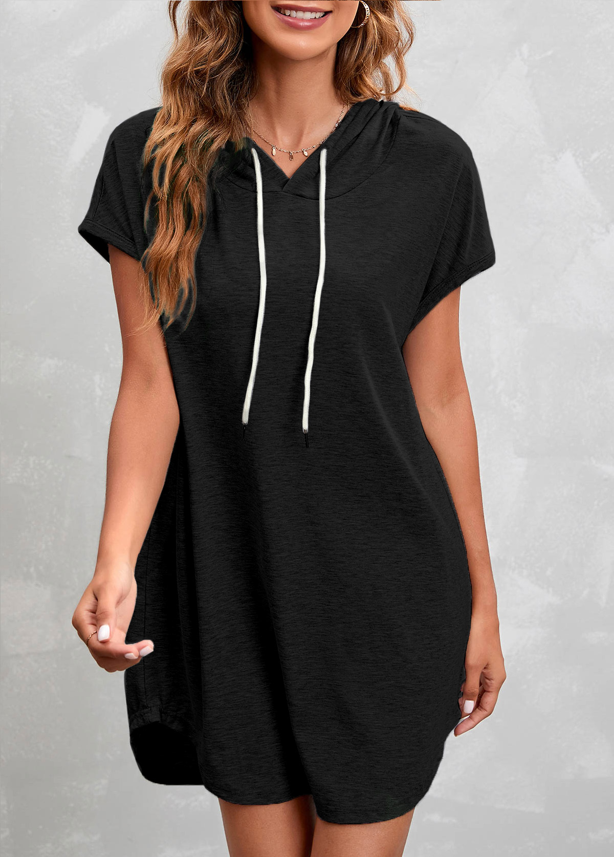 • Drawstring Short Sleeve Black Hooded Collar Dress