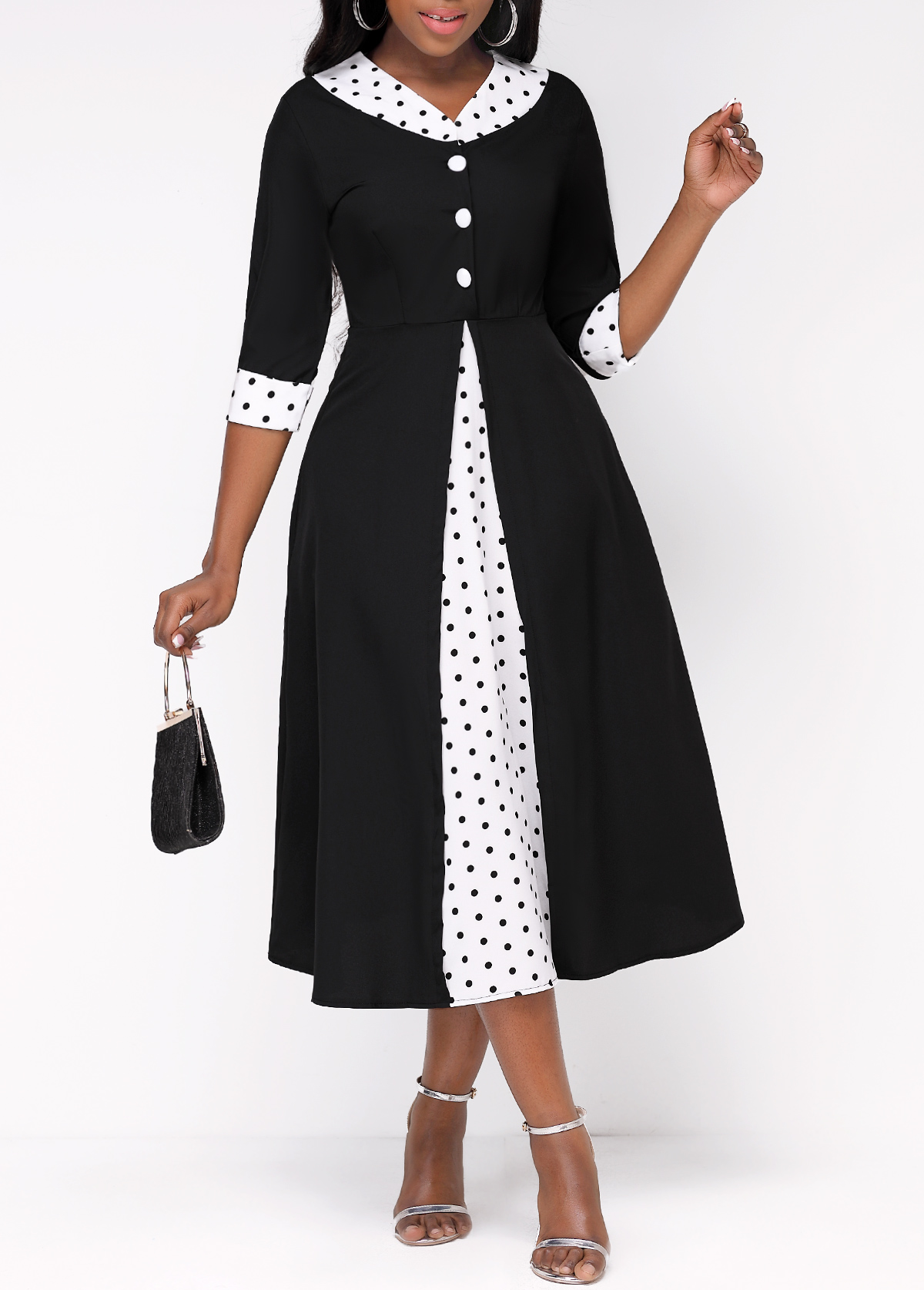 • Faux Two Piece Polka Dot Black Dress
