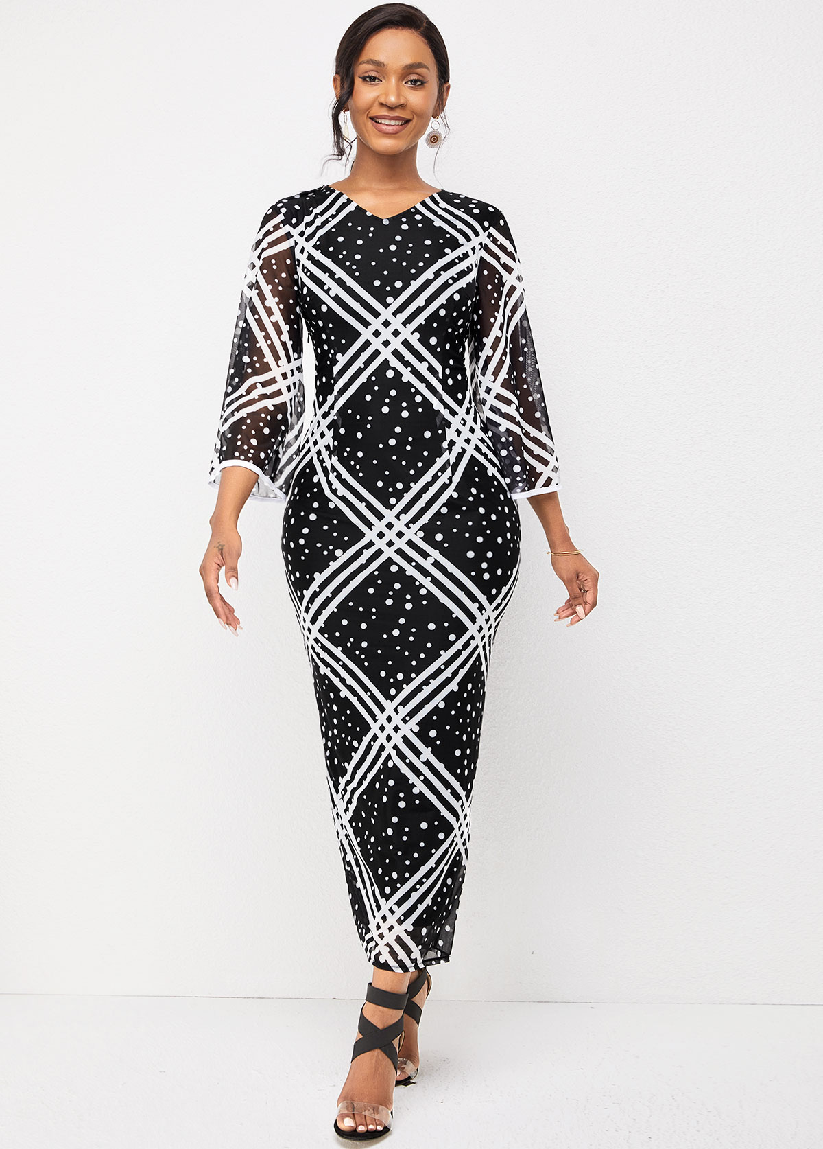 Flare Sleeve V Neck Striped and Polka Dot Dress