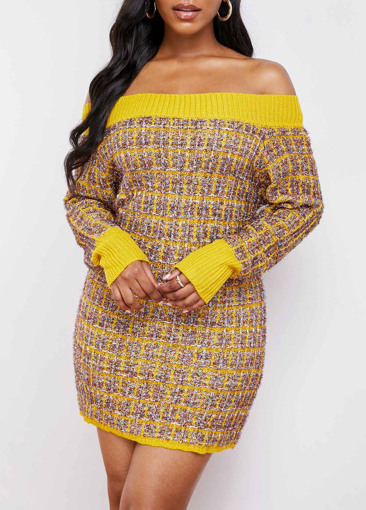 • Off Shoulder Long Sleeve Contrast Sweater Dress