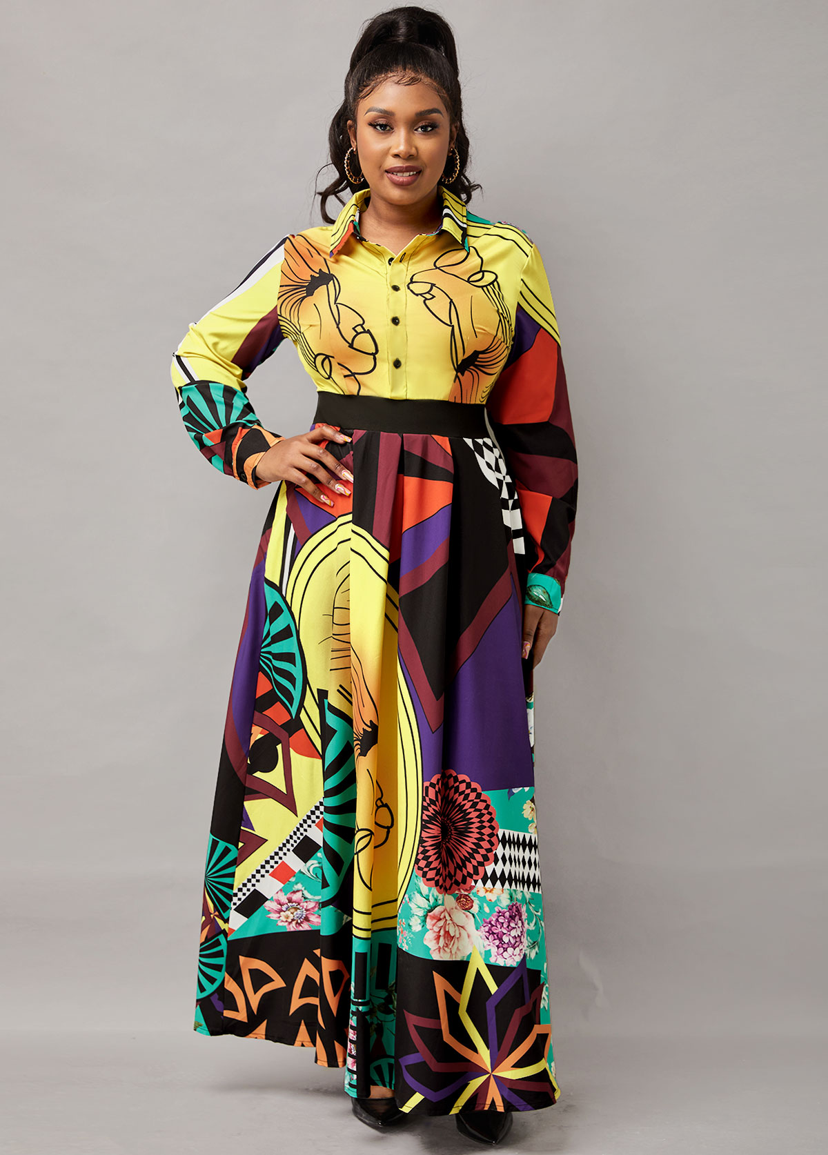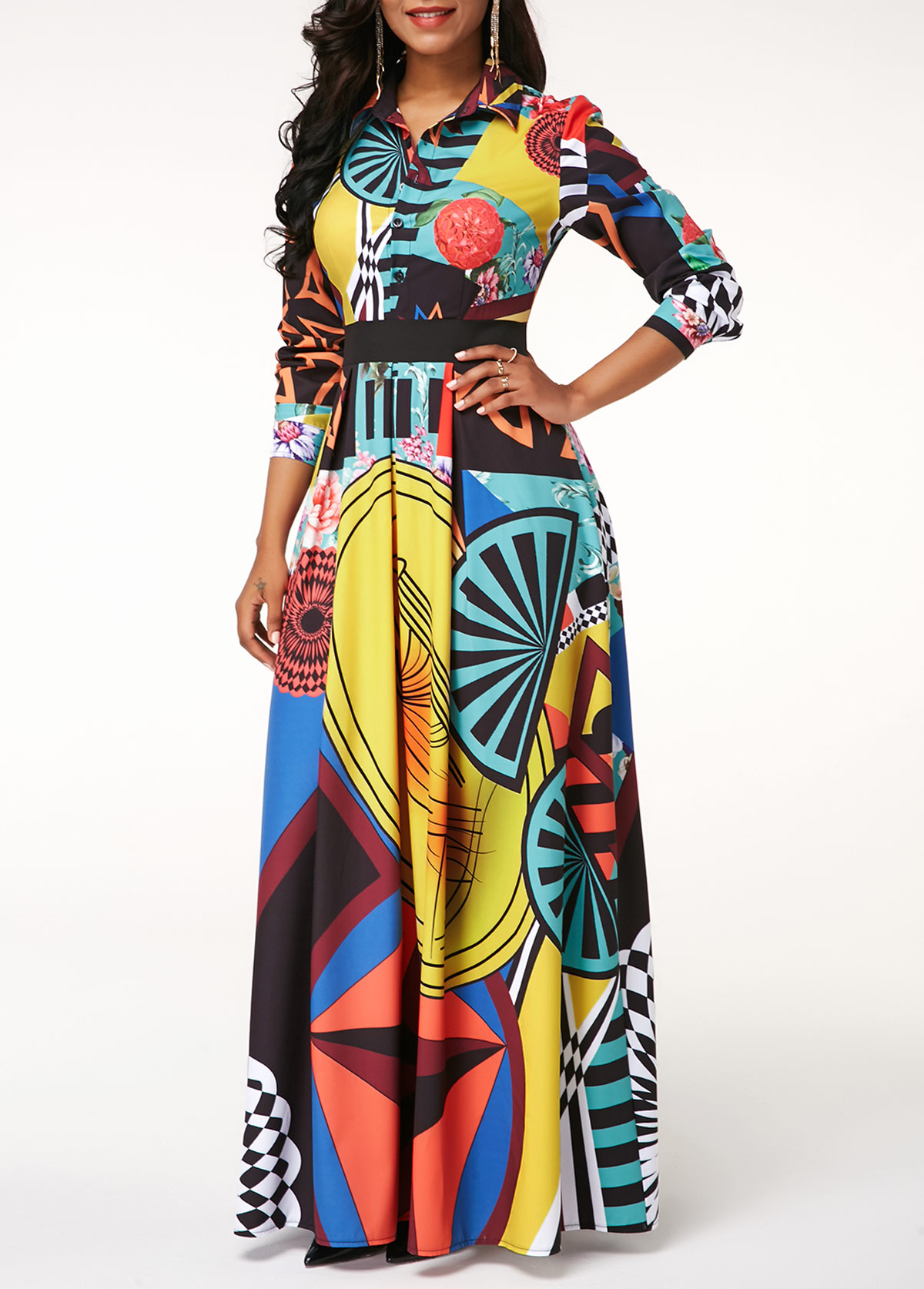 • Printed Button Up Long Sleeve Turndown Collar Dress
