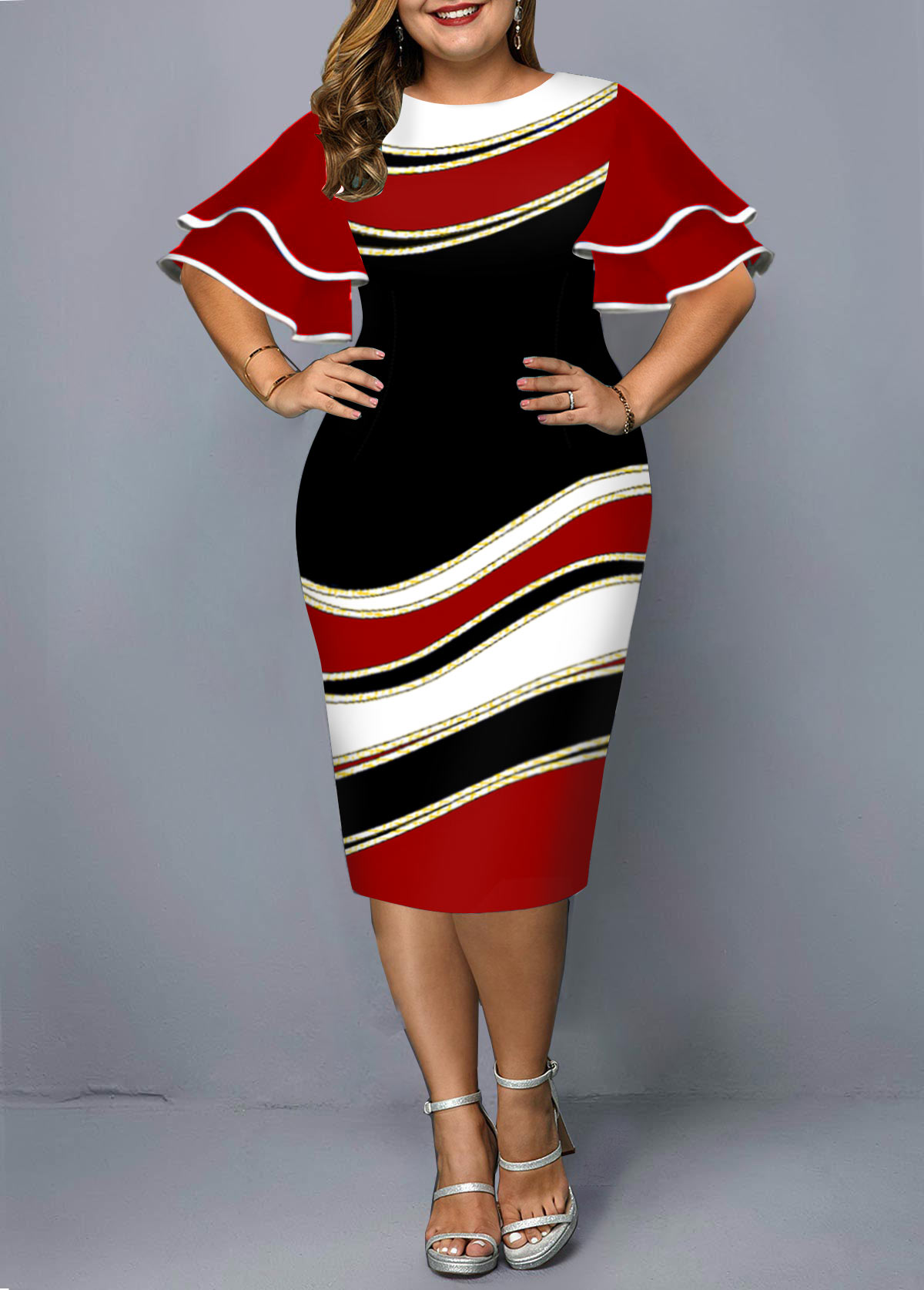 • Round Neck Geometric Print Ruffle Sleeve Dress
