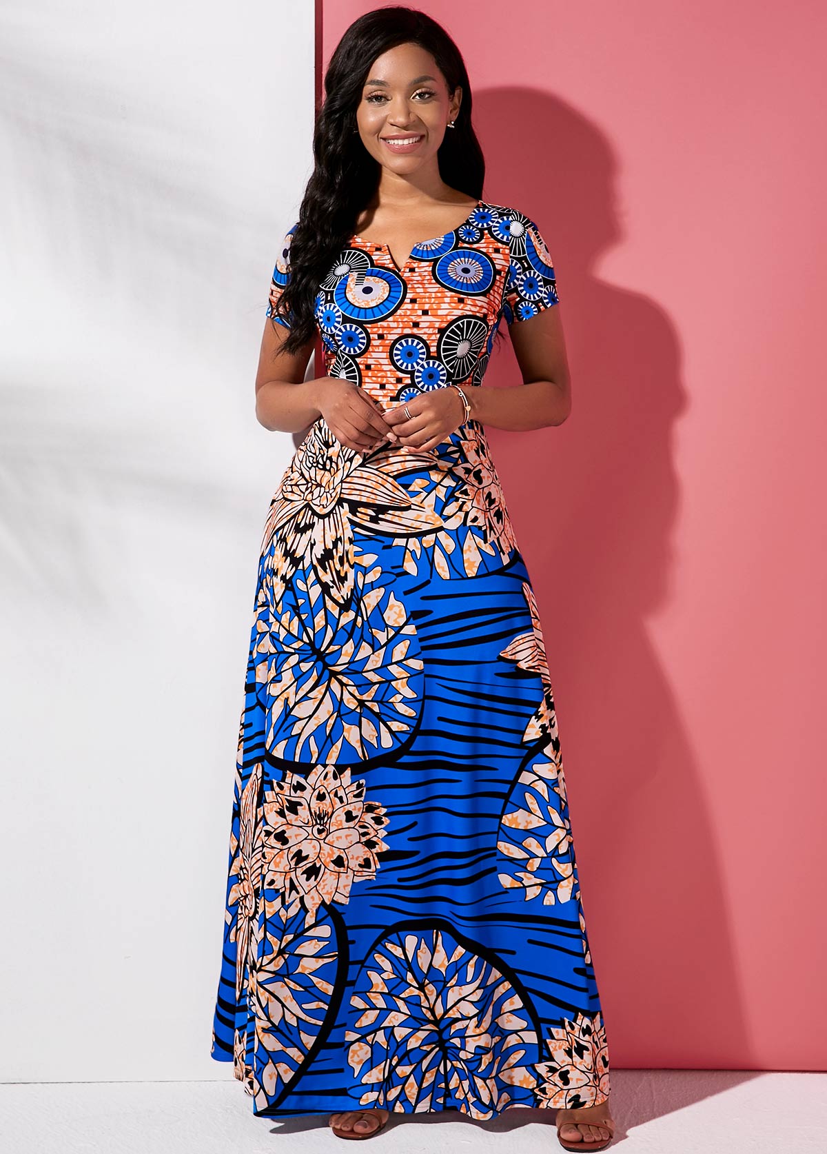 Round Neck Short Sleeve Tribal Print Maxi Dress