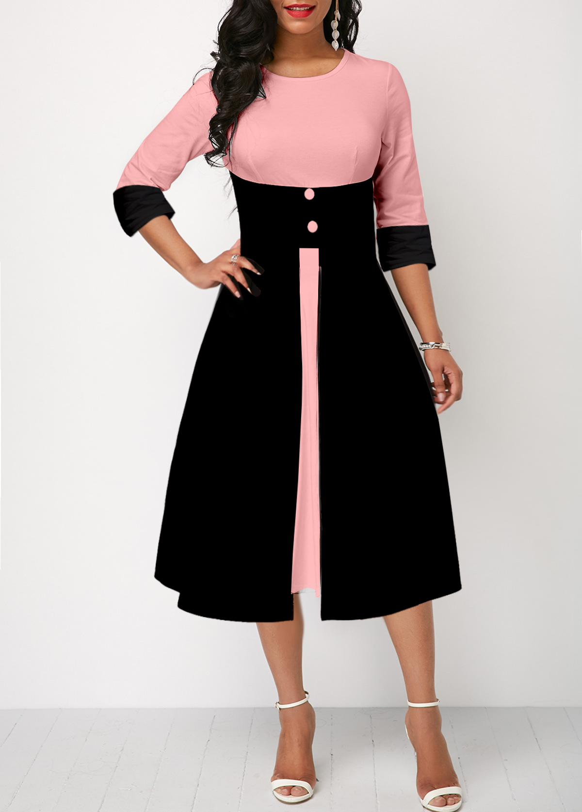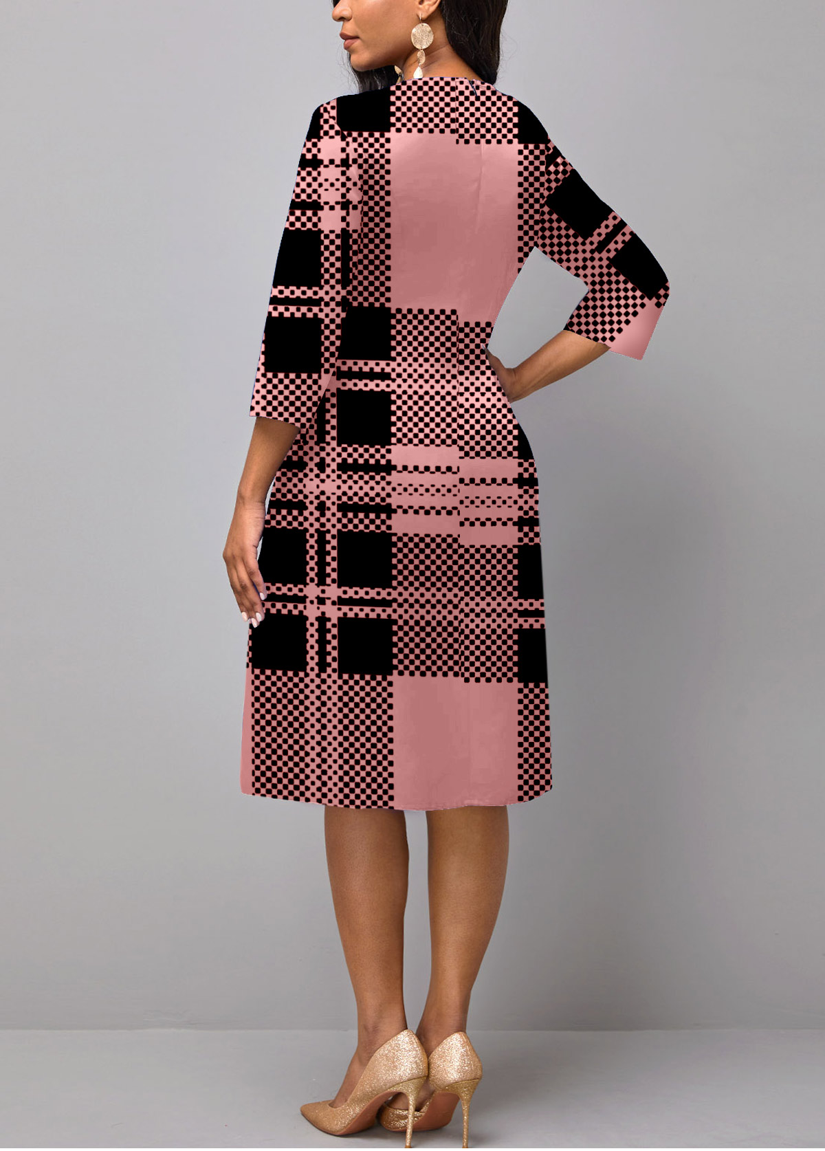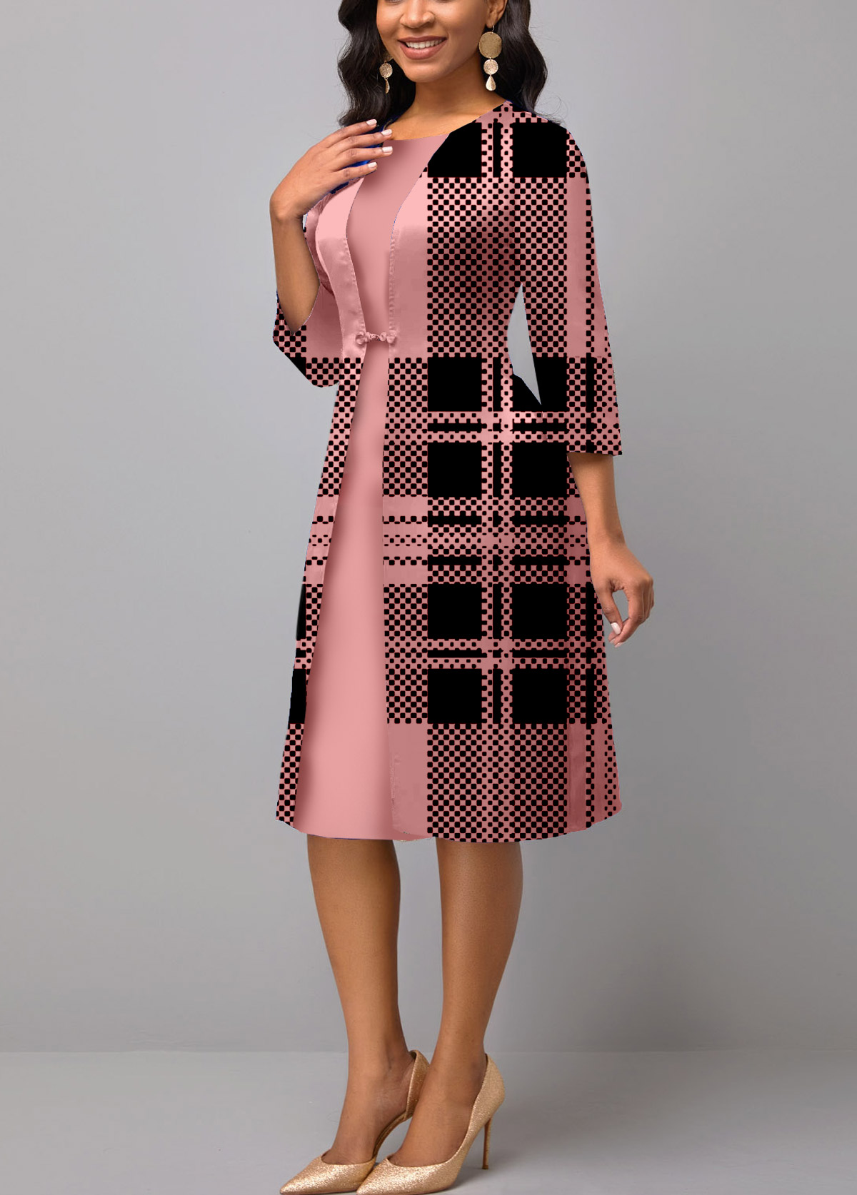 Pink 3/4 Sleeve Plaid Faux Two Piece Dress
