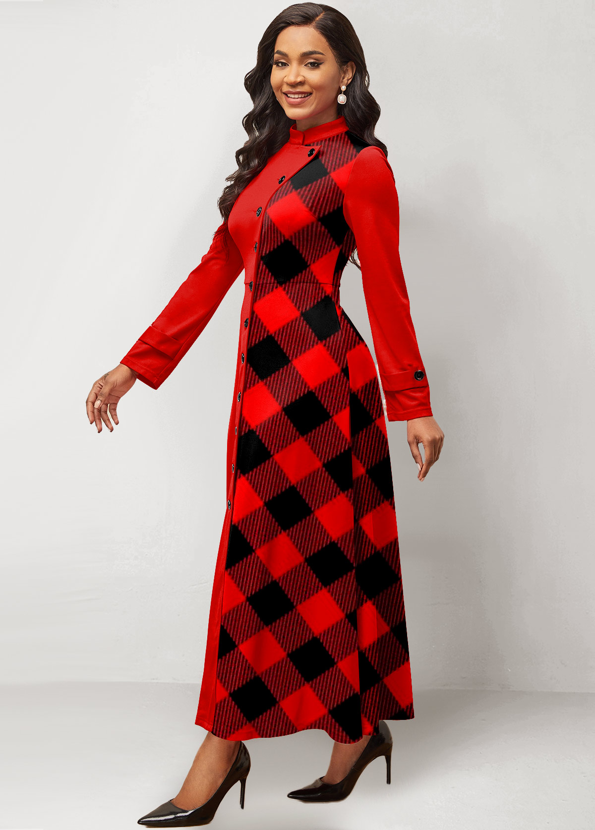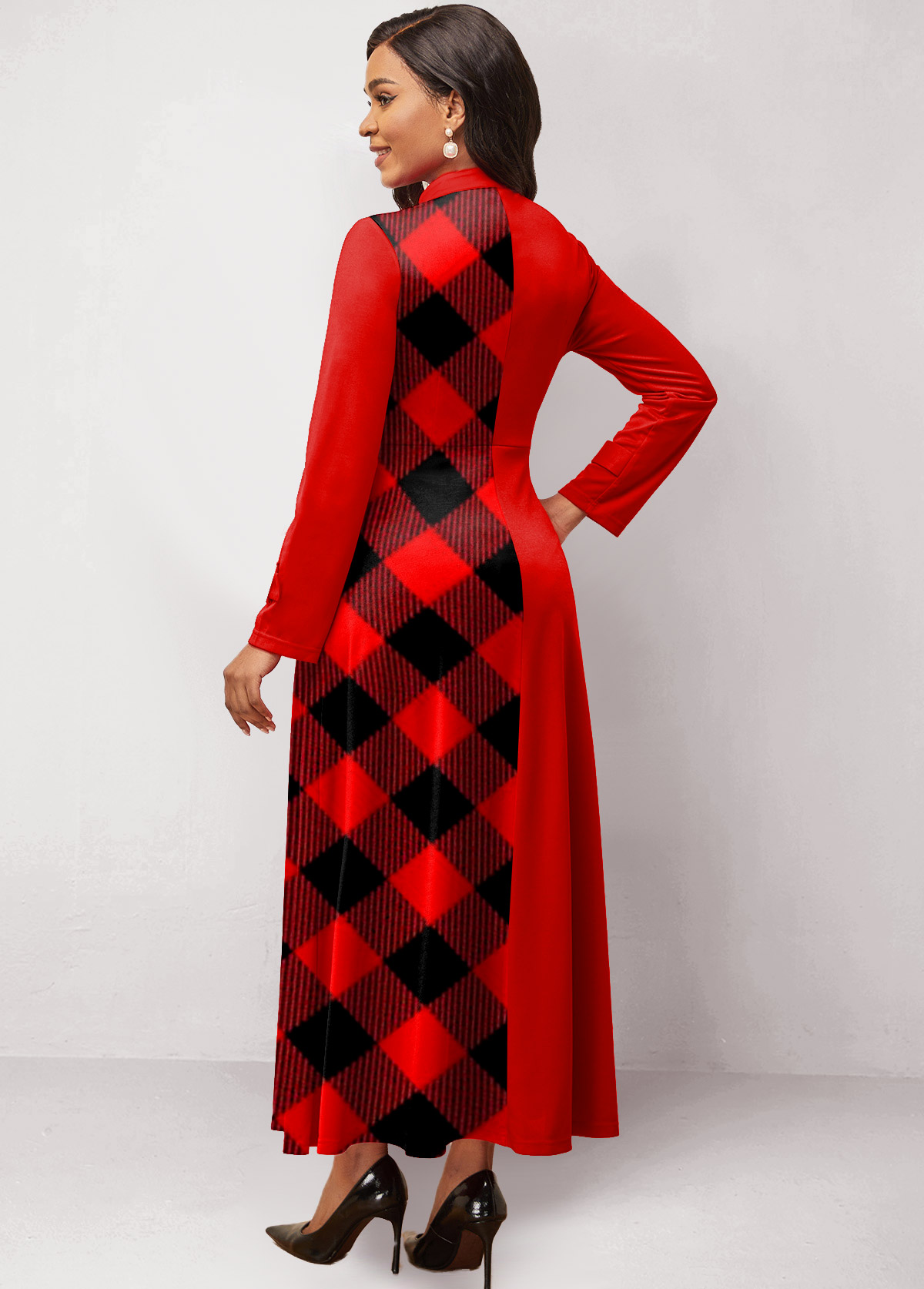 Plaid Patchwork Stand Collar Maxi Dress