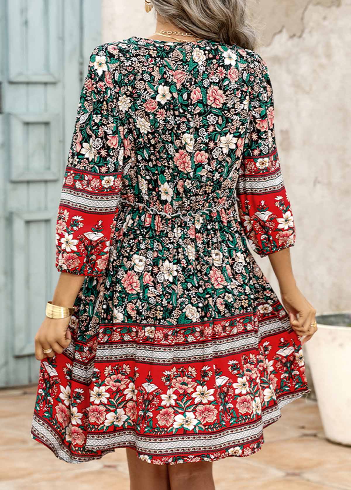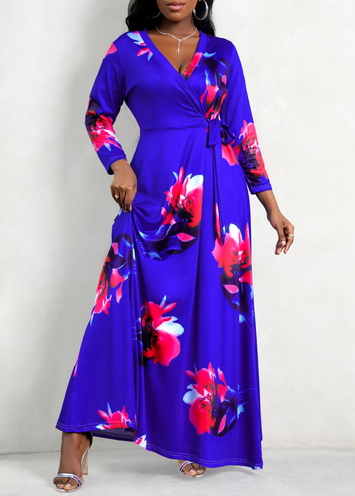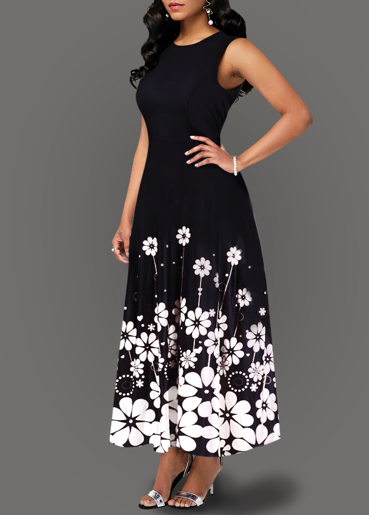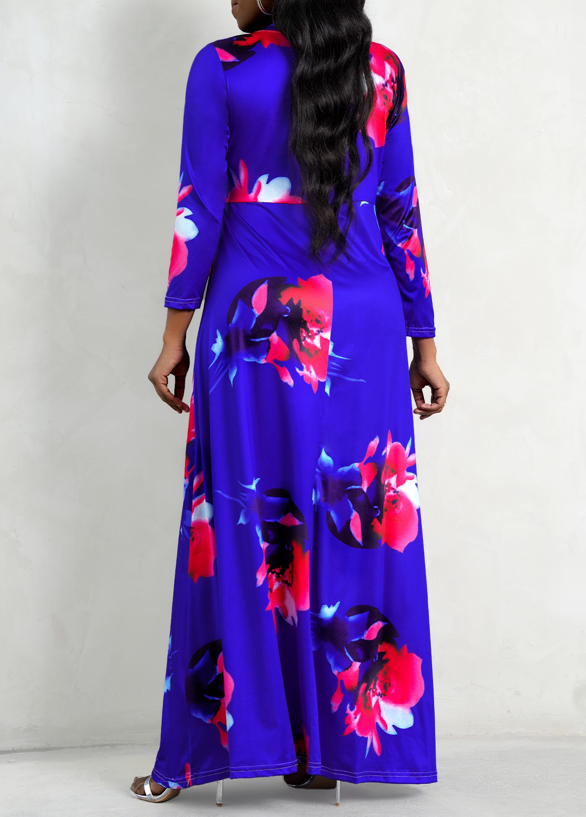 Round Neck Flower Print Color Block Maxi Dress