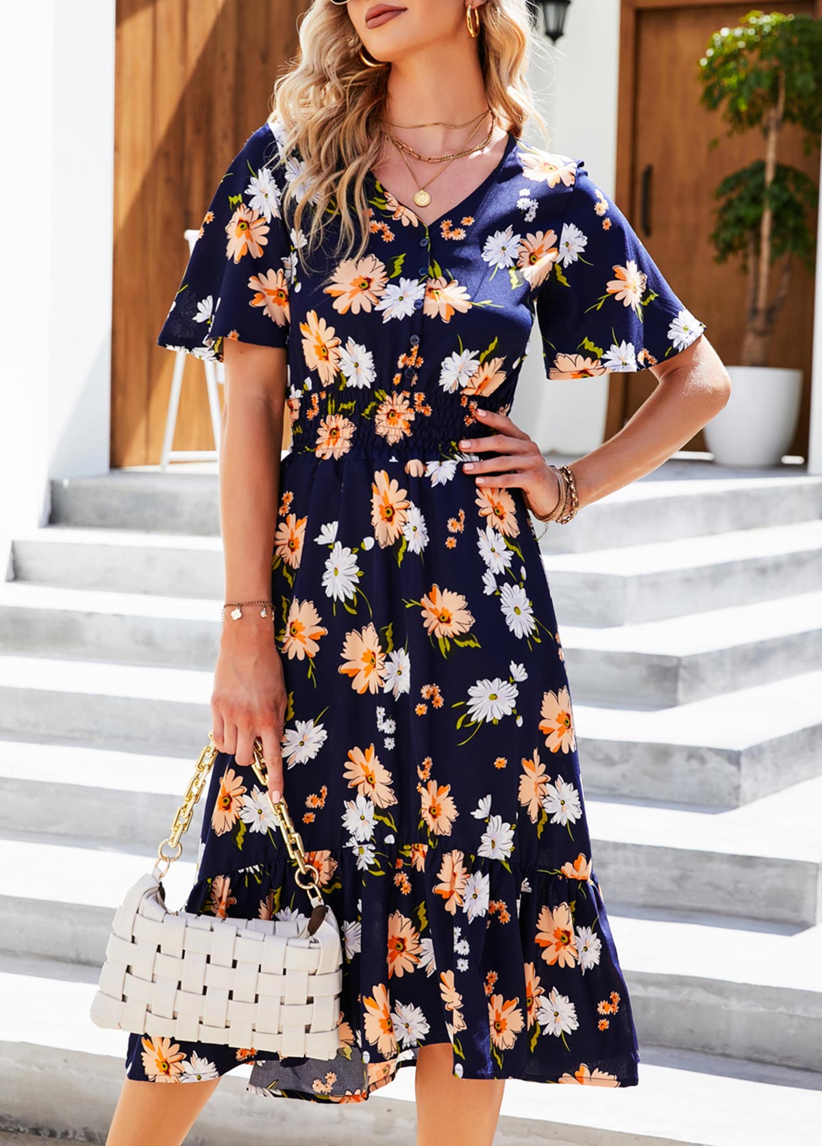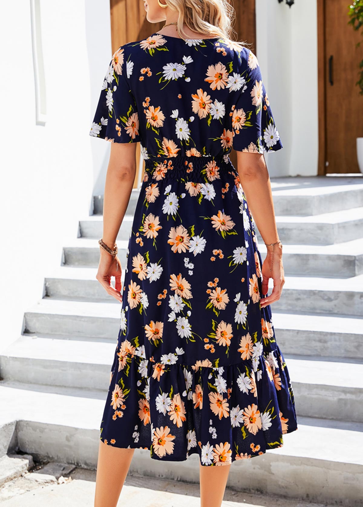 Navy Blue Smocked Floral Print Flounce Dress