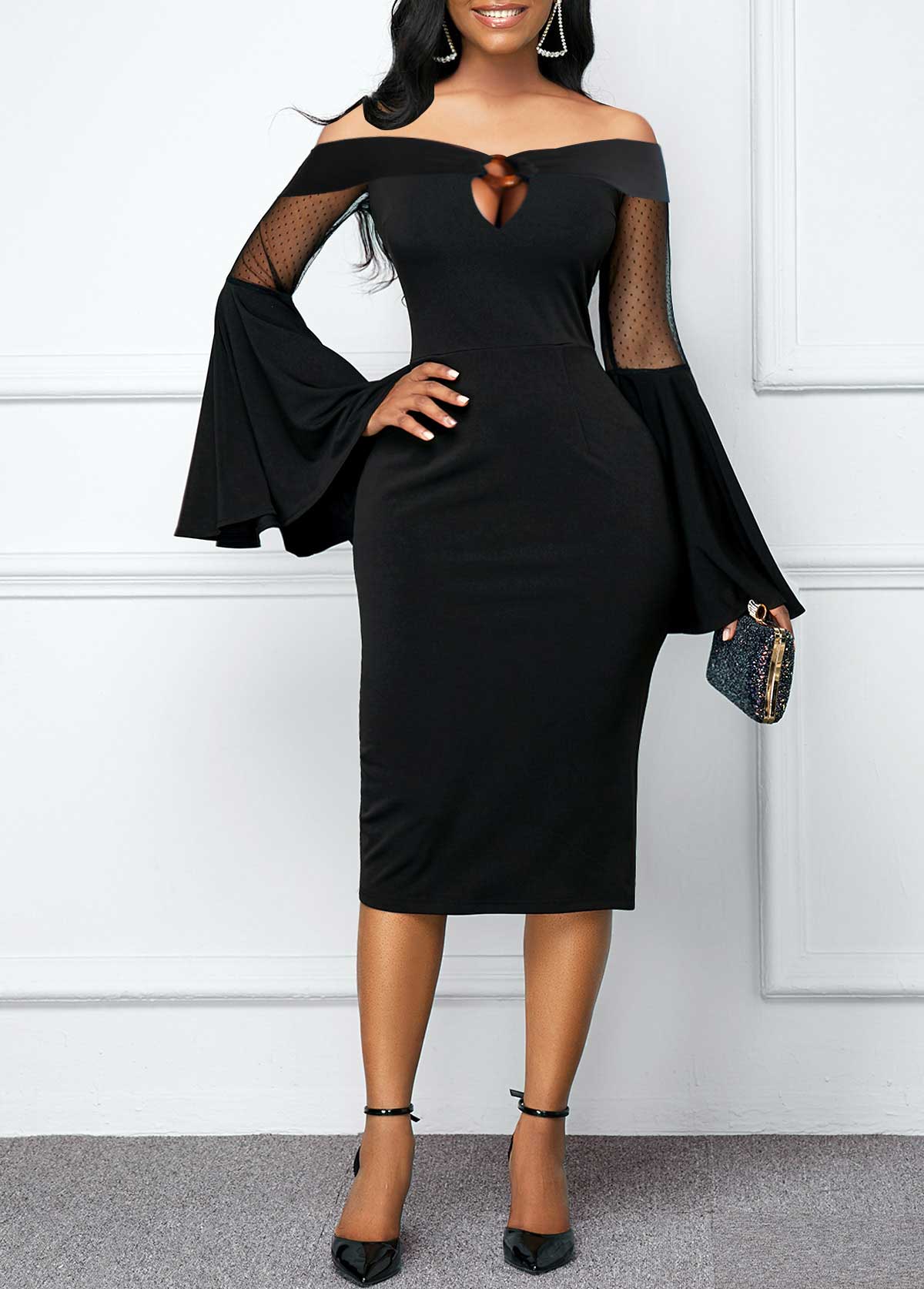 Off Shoulder Flare Sleeve Black Mesh Dress