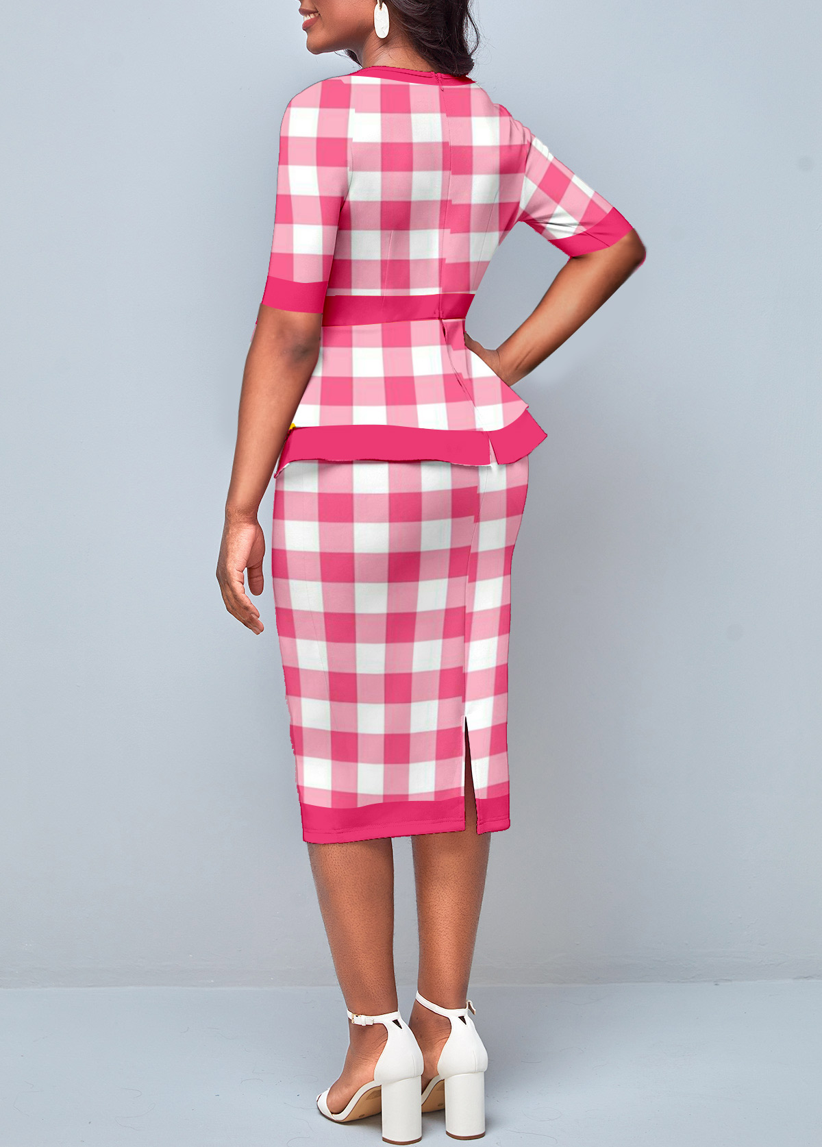 Pink Plaid Round Neck Bodycon Dress