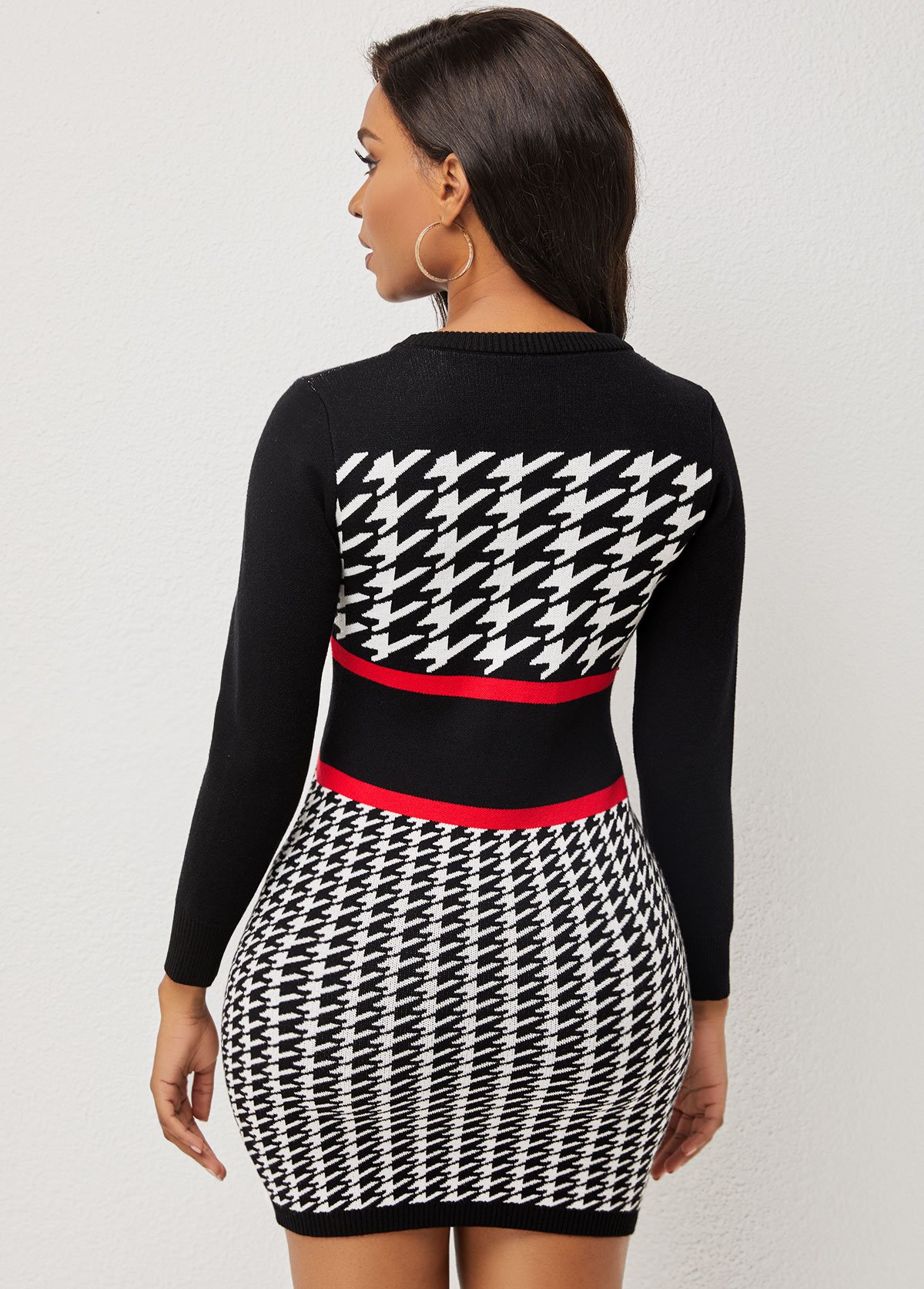 Round Neck Houndstooth Print Long Sleeve Sweater Dress