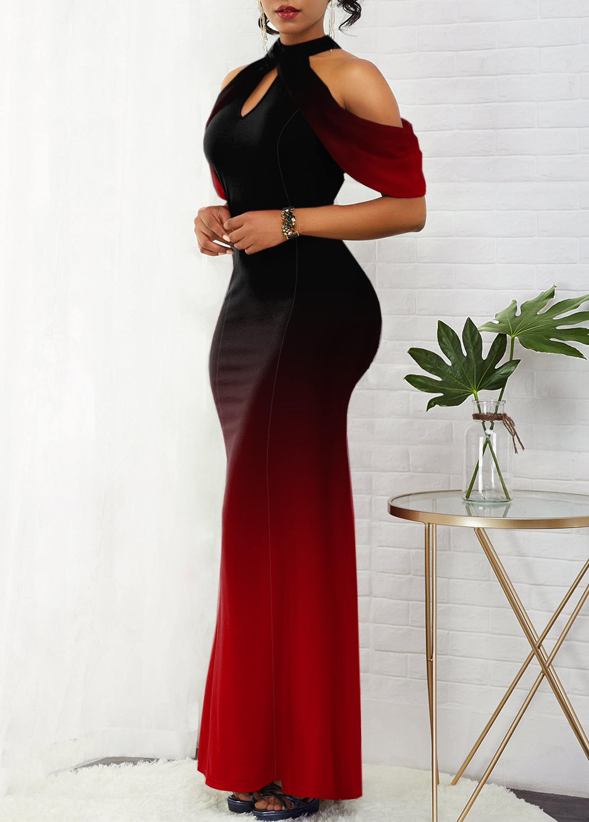 Ombre Bib Neck Cold Shoulder Mermaid Dress