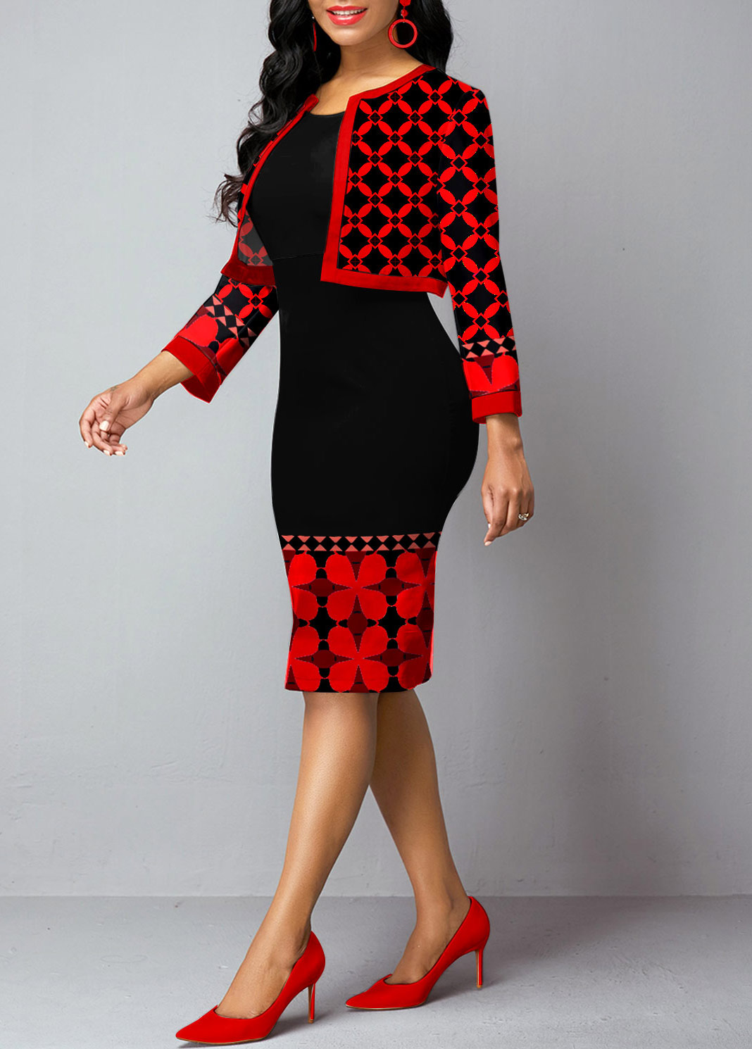 Open Front Tribal Print Cardigan and Sheath Dress
