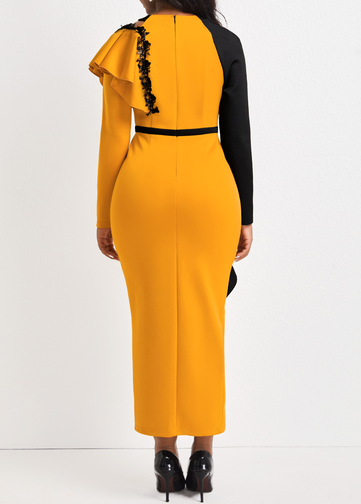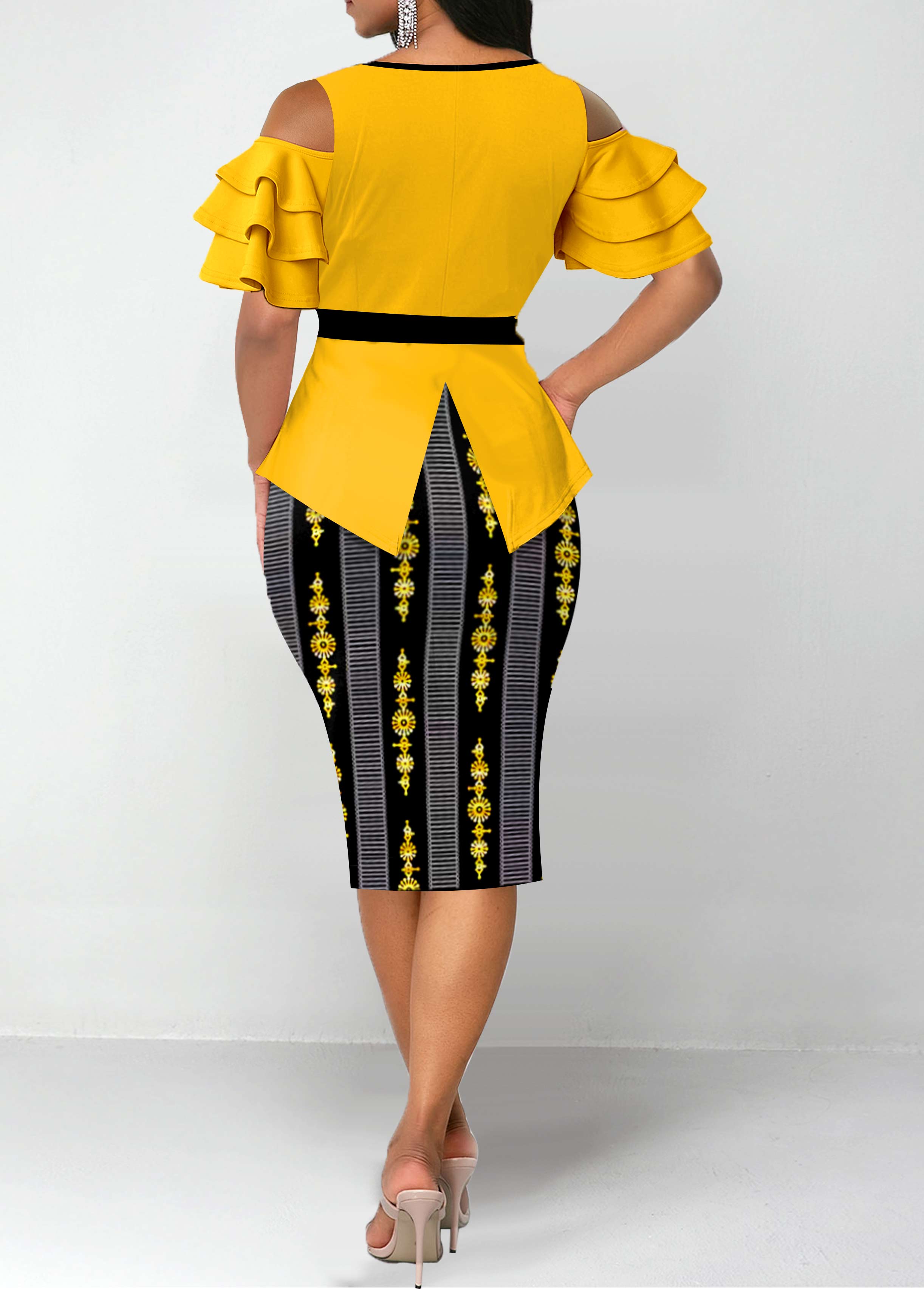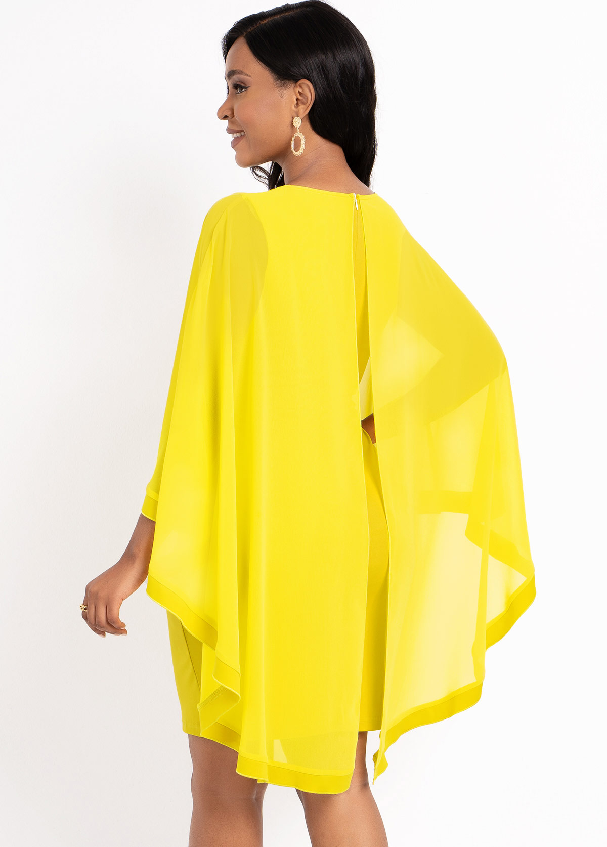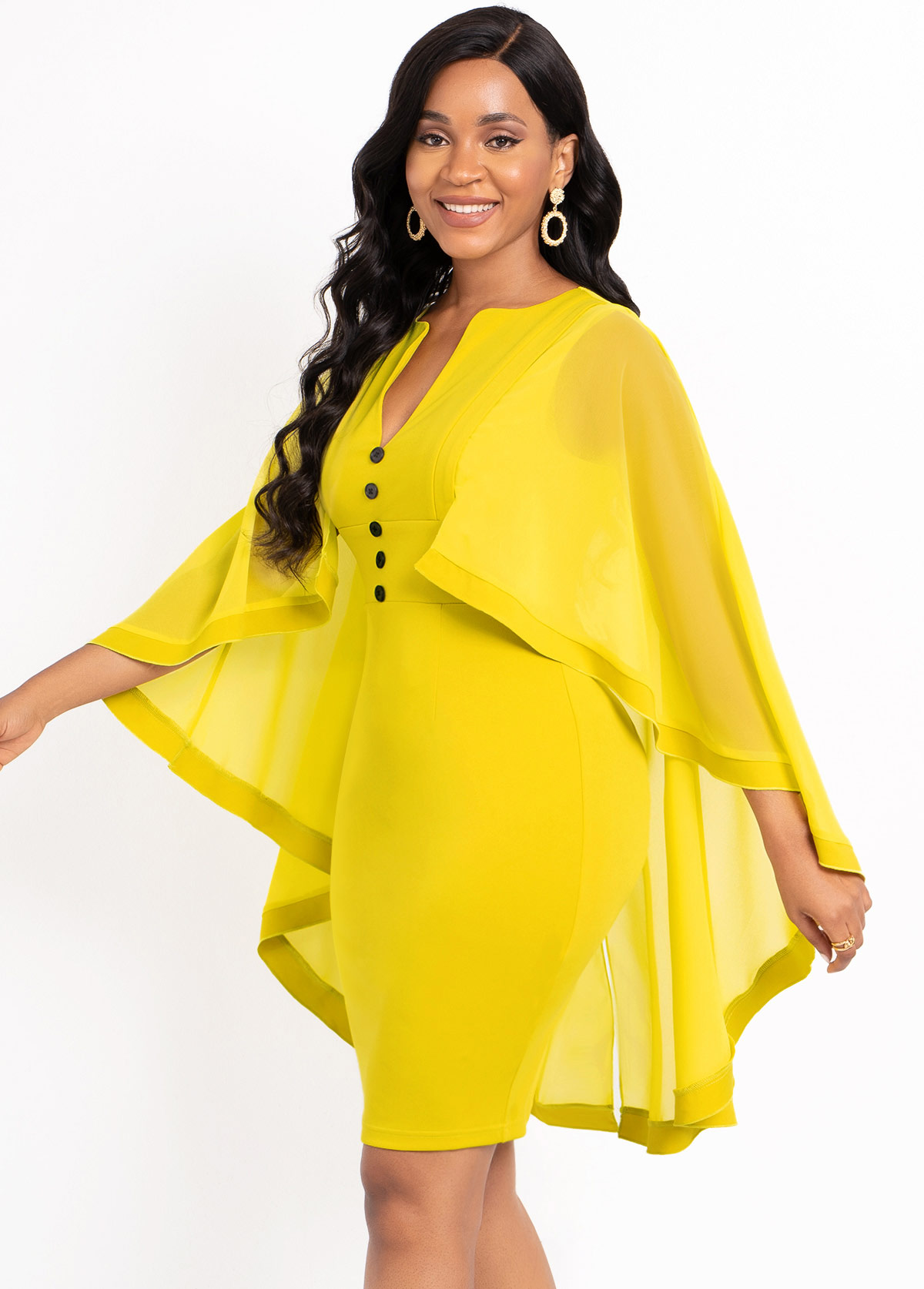 Decorative Button Mesh Stitching Yellow Cape Sleeve Dress