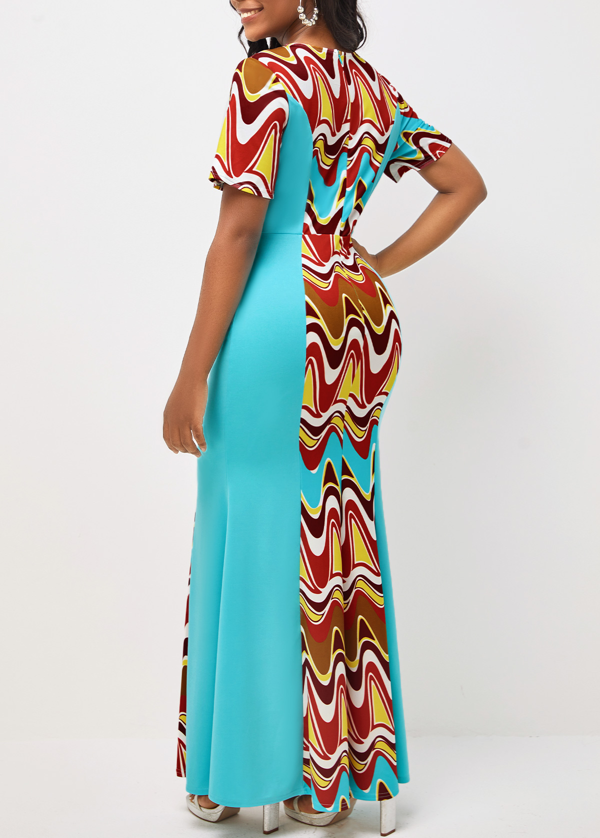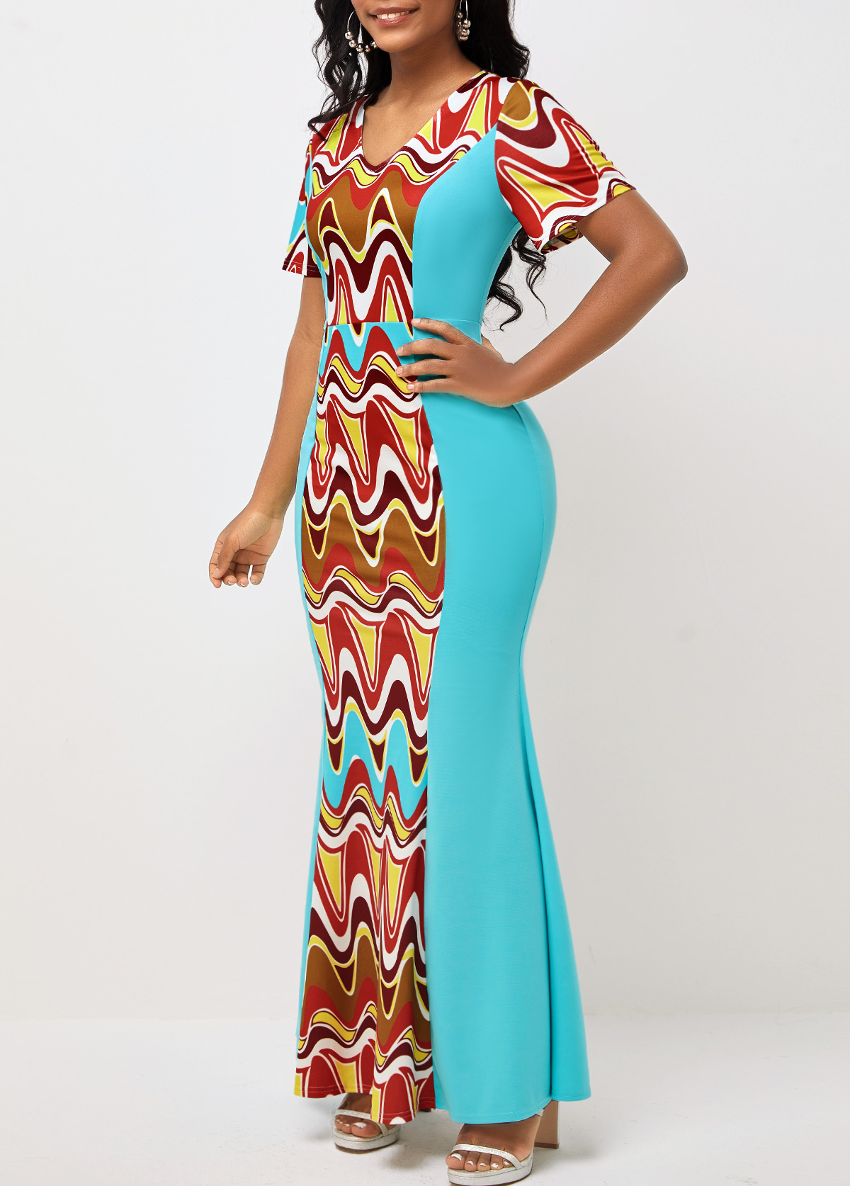 Cyan Tribal Print Short Sleeve V Neck Dress