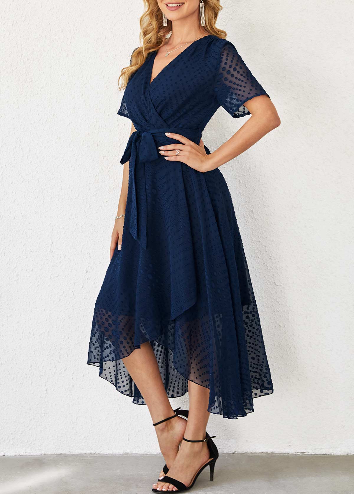 Chiffon Lace Stitching Asymmetric Hem Navy Blue Dress