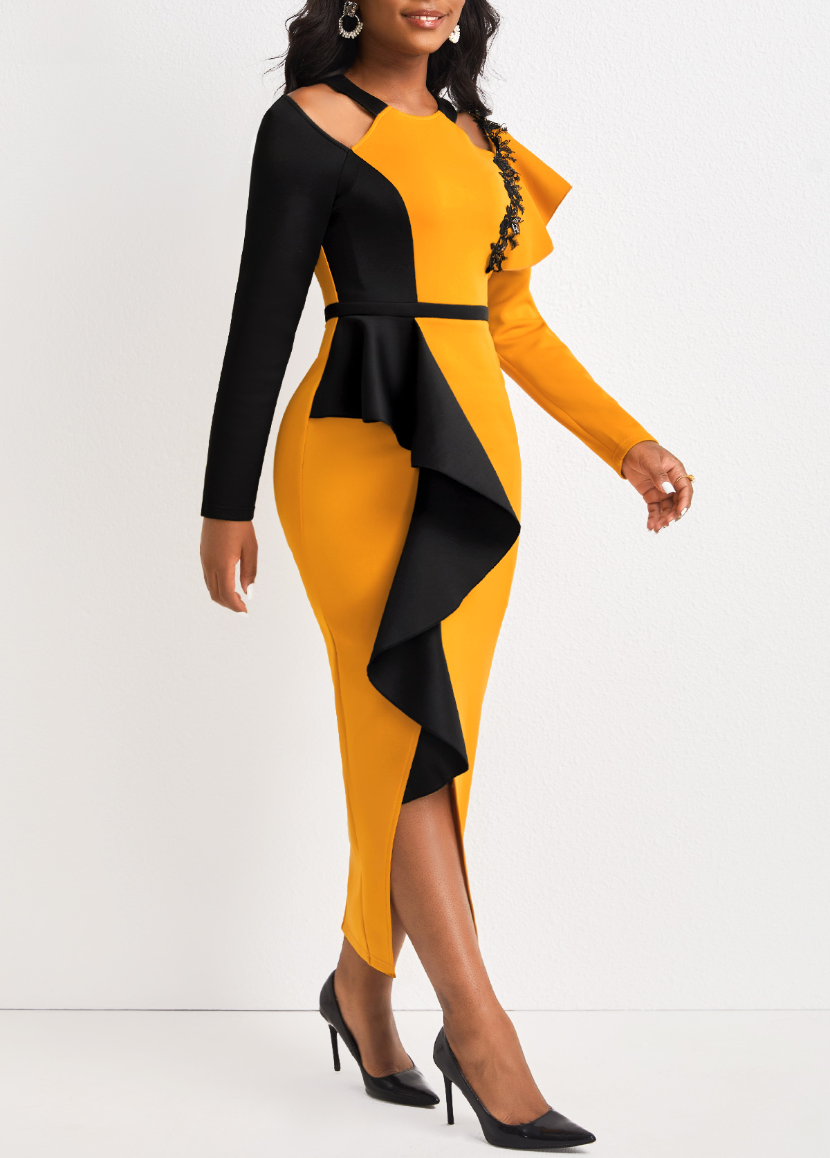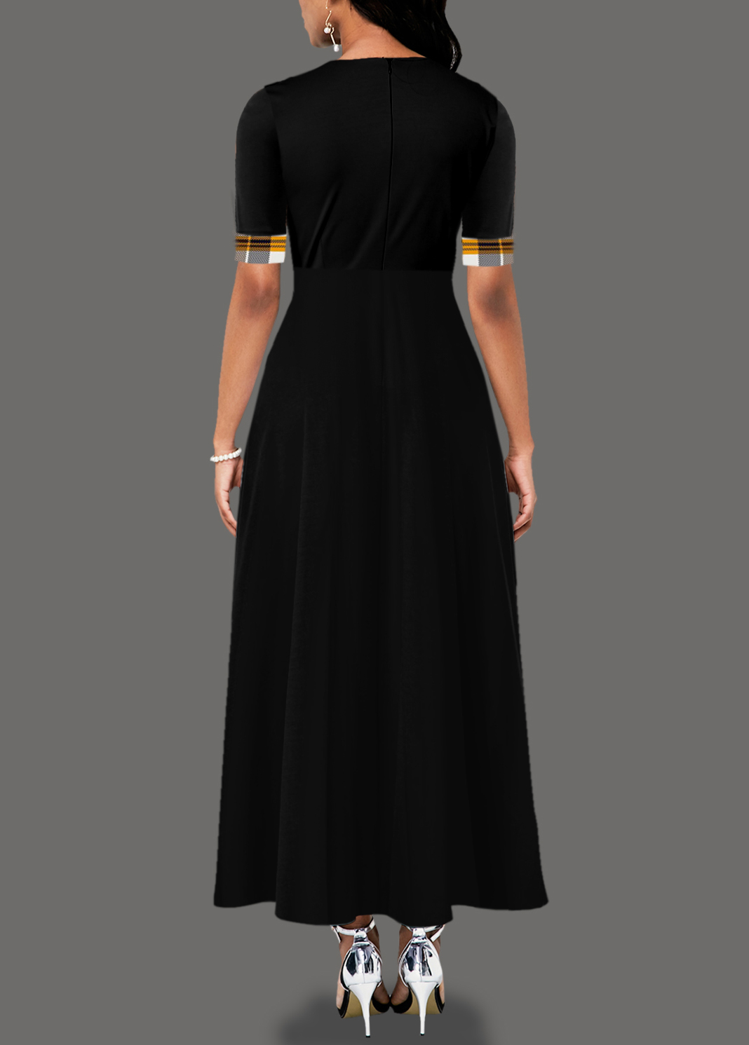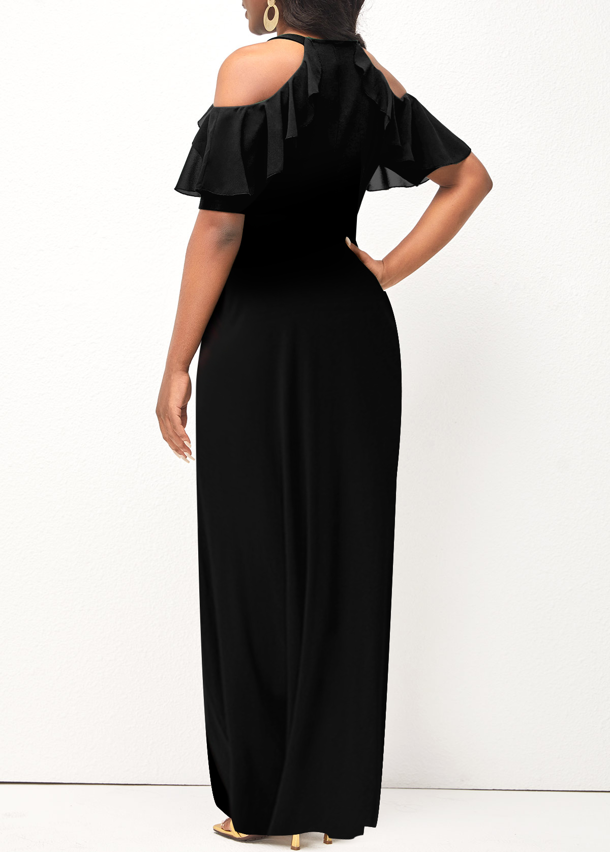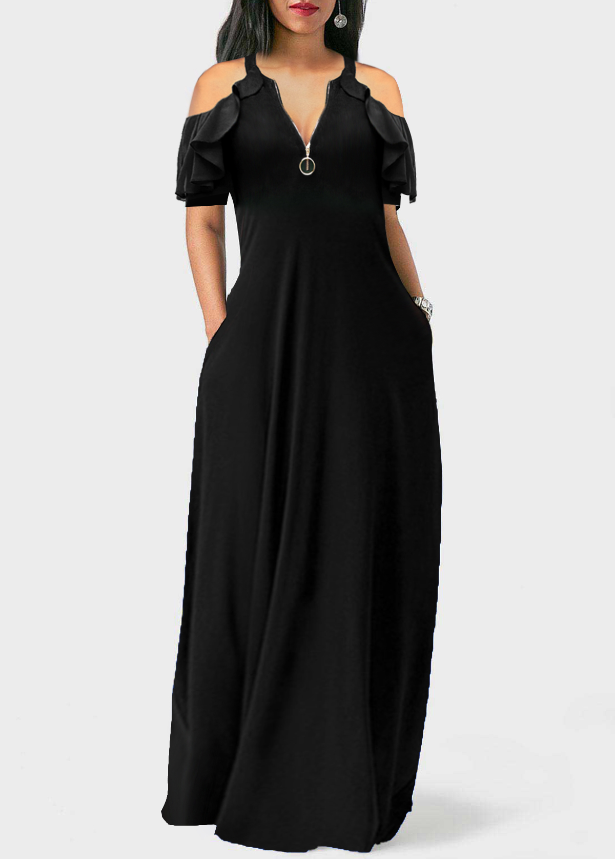 Double Side Pockets Black Cold Shoulder Maxi Dress