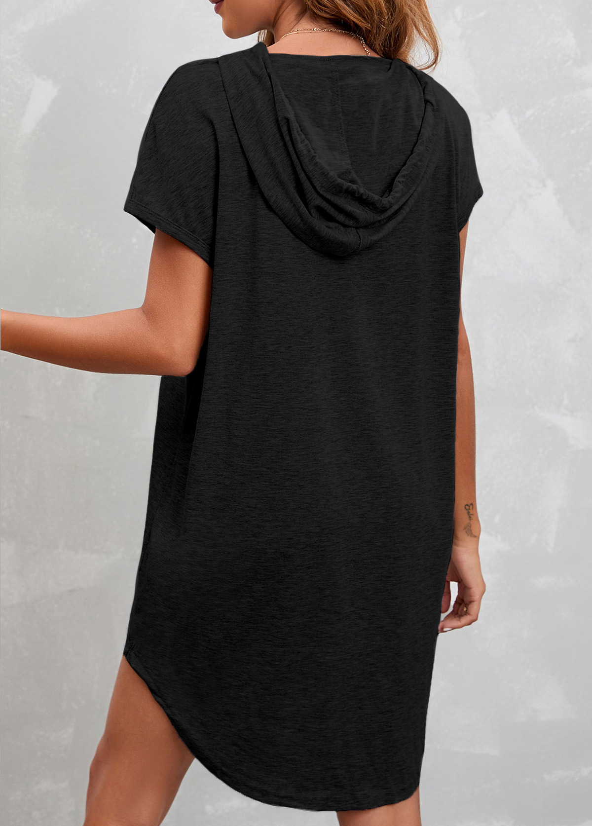 Drawstring Short Sleeve Black Hooded Collar Dress