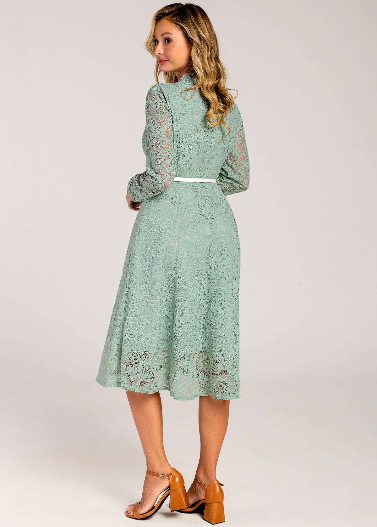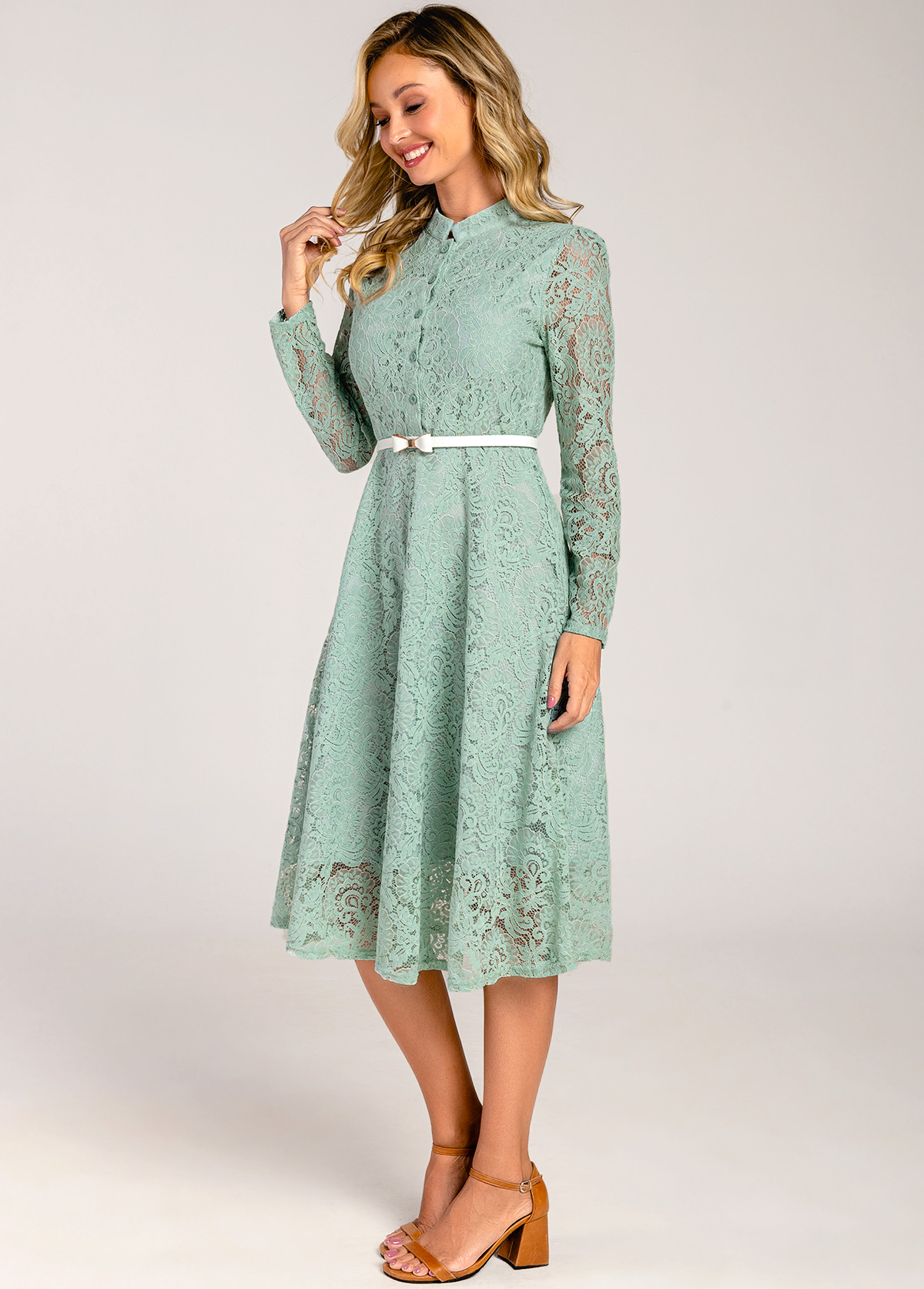 Bowknot Belted Lace Trim Mock Neck Sage Green Dress
