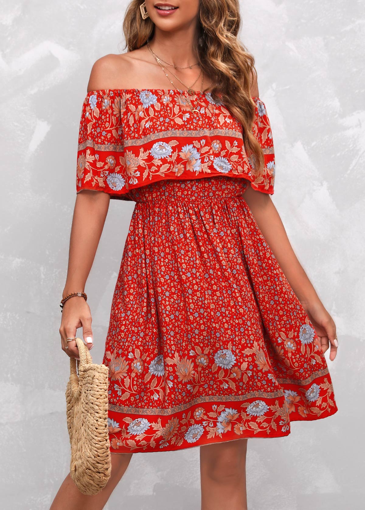 Bohemian Print Orange Red Off Shoulder Dress