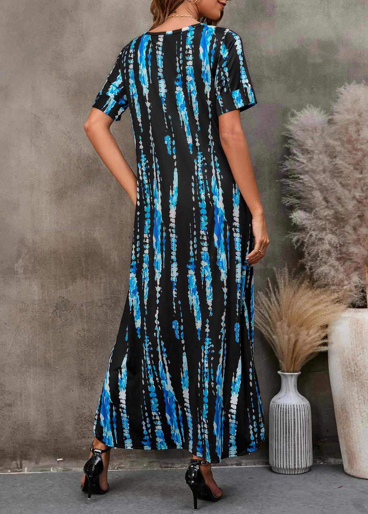 Blue Striped Double Side Pockets V Neck Dress