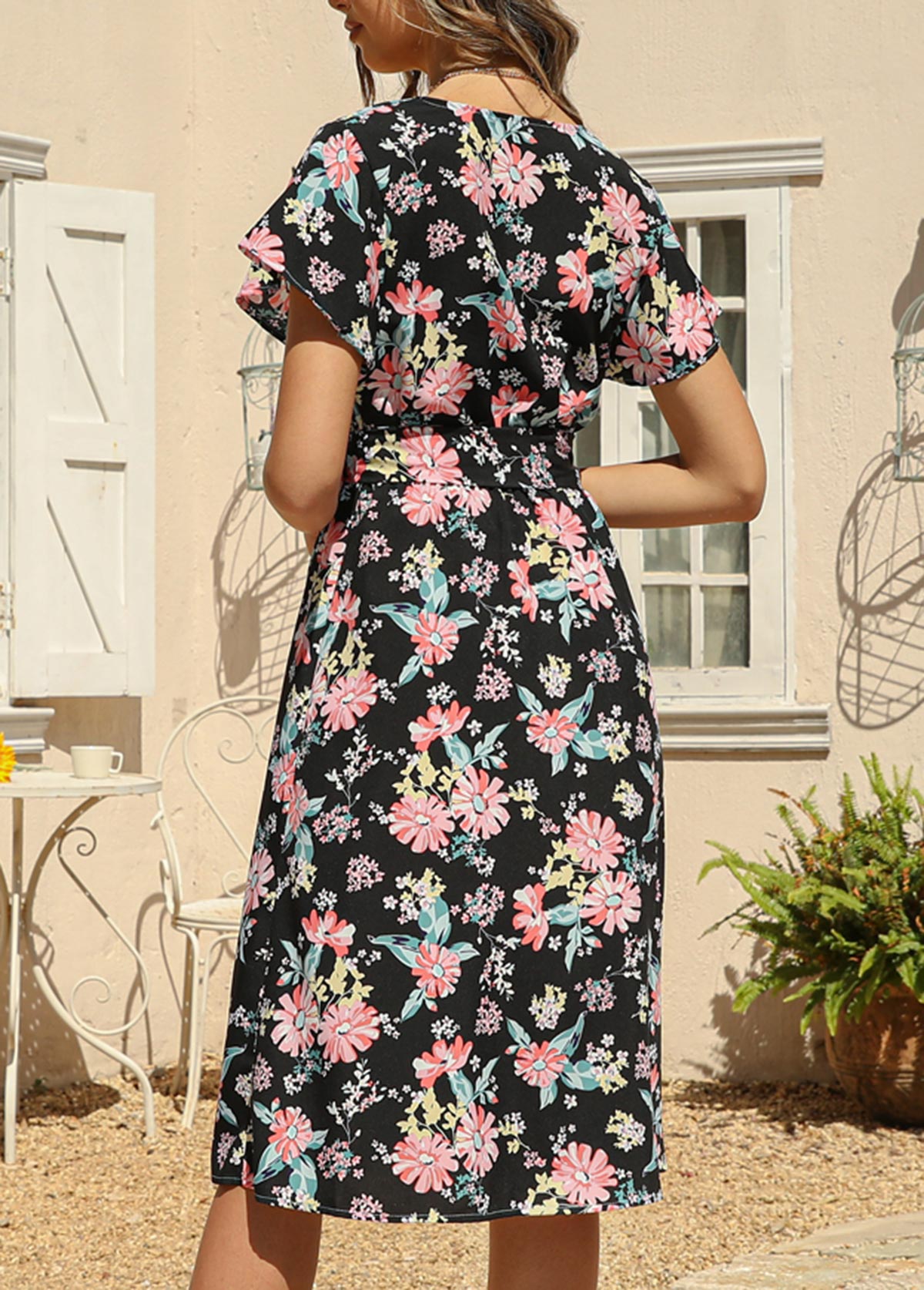 Black Belted Floral Print Cross Front Dress