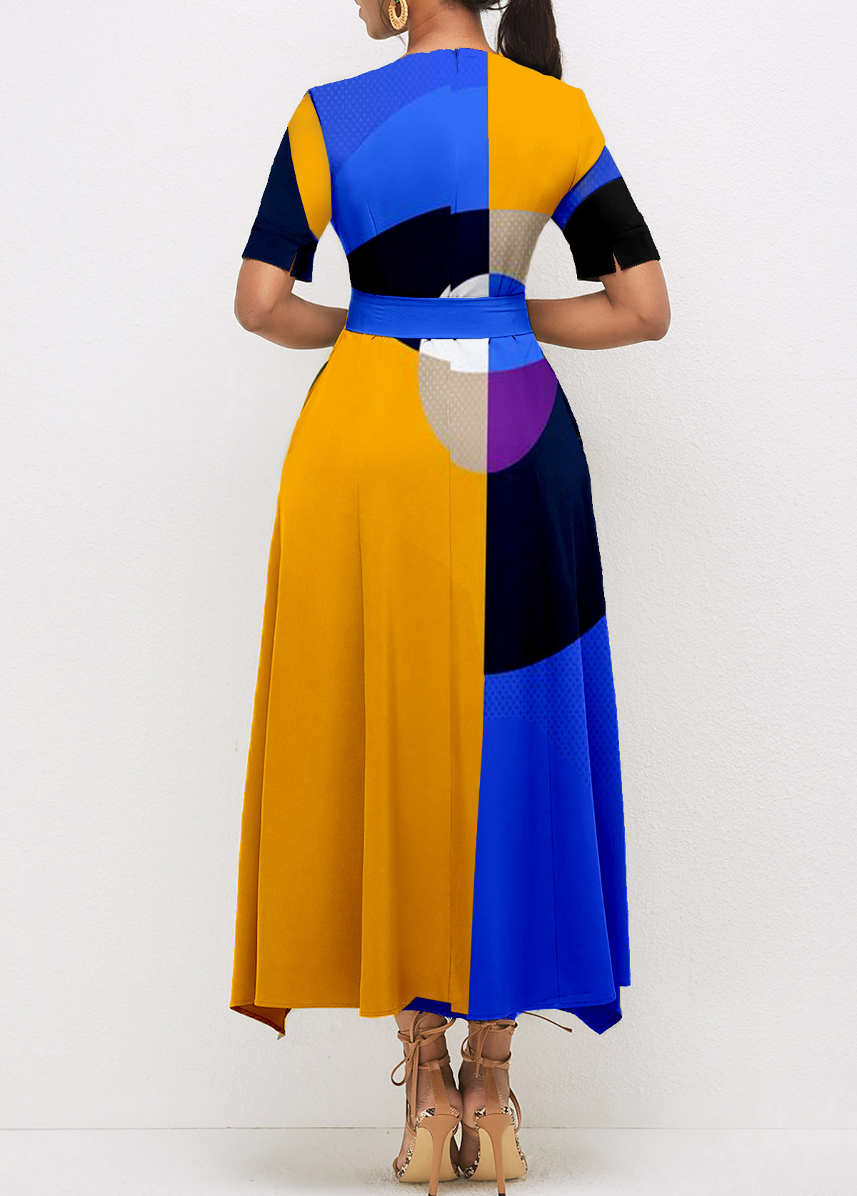 Belted Geometric Print Color Block Dress