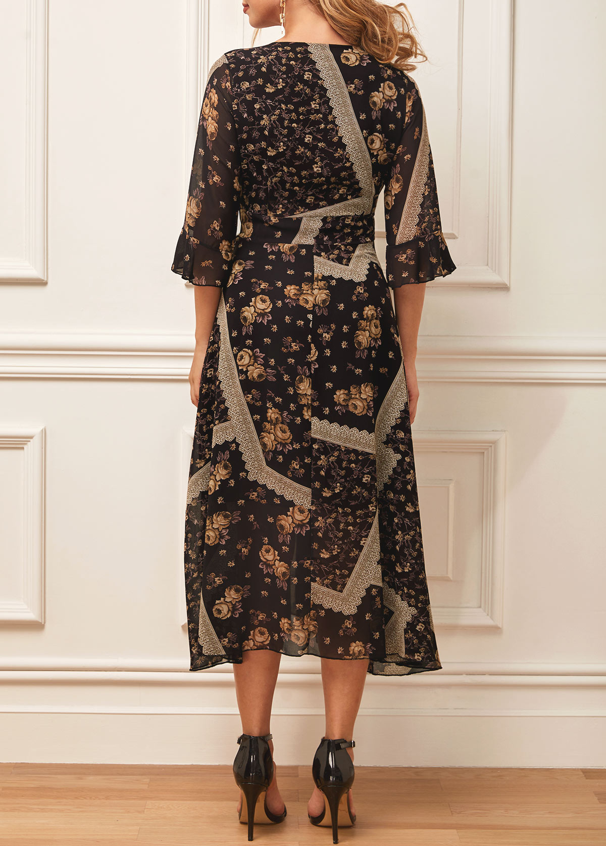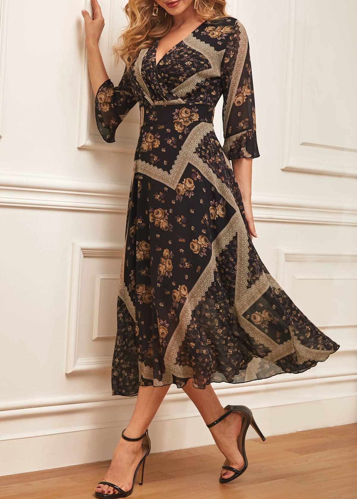 Black Chiffon Floral Print V Neck Dress