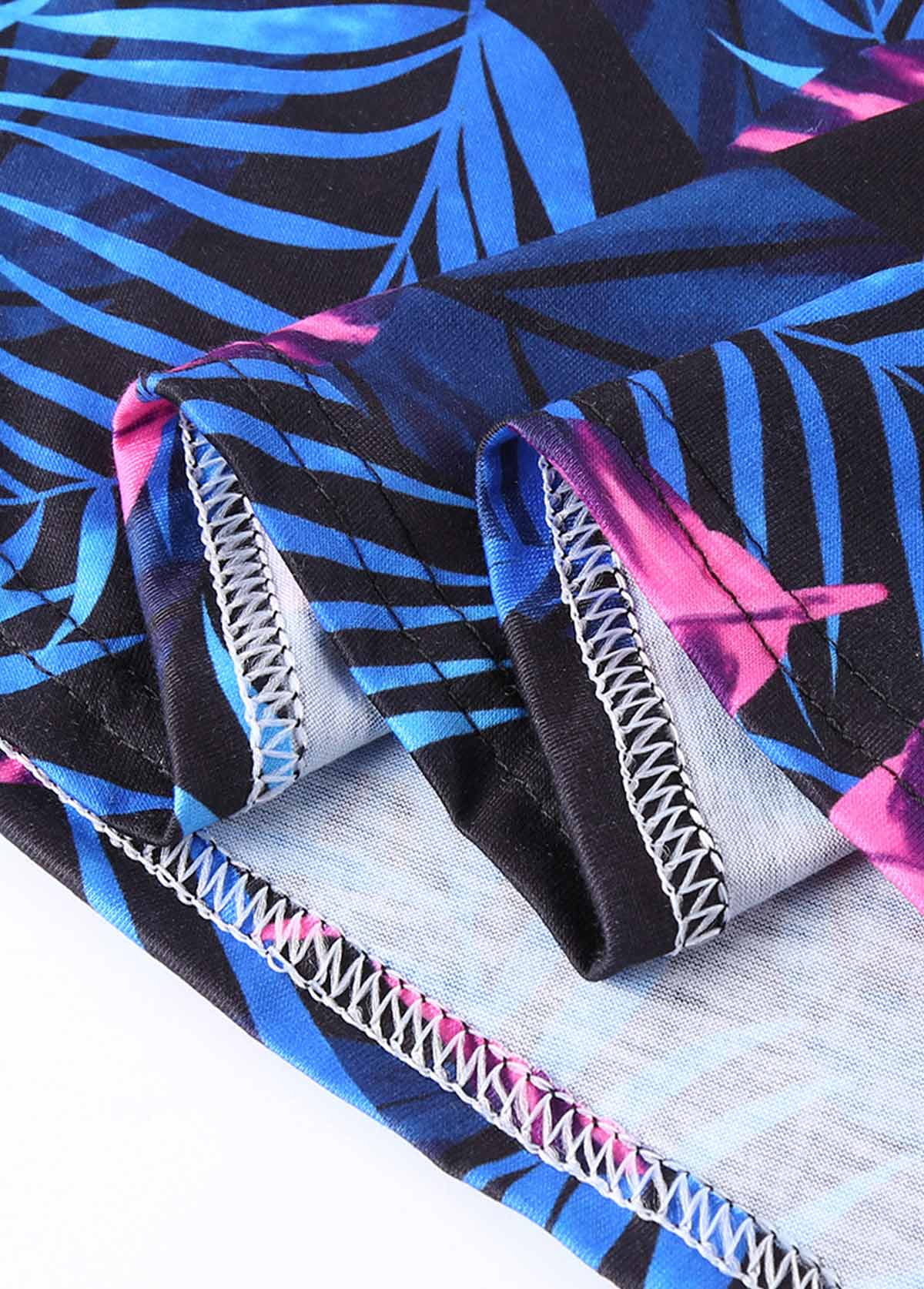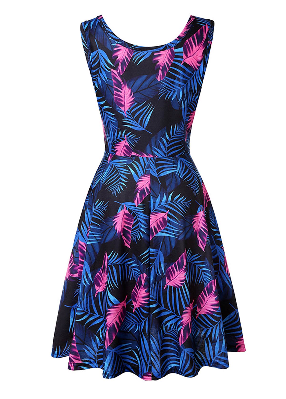 Blue Leaf Print Sleeveless Round Neck Dress