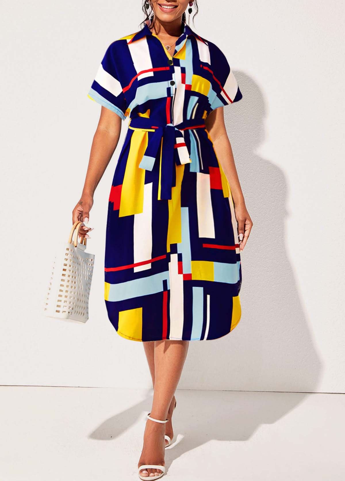 Button Up Belted Geometric Print Dress
