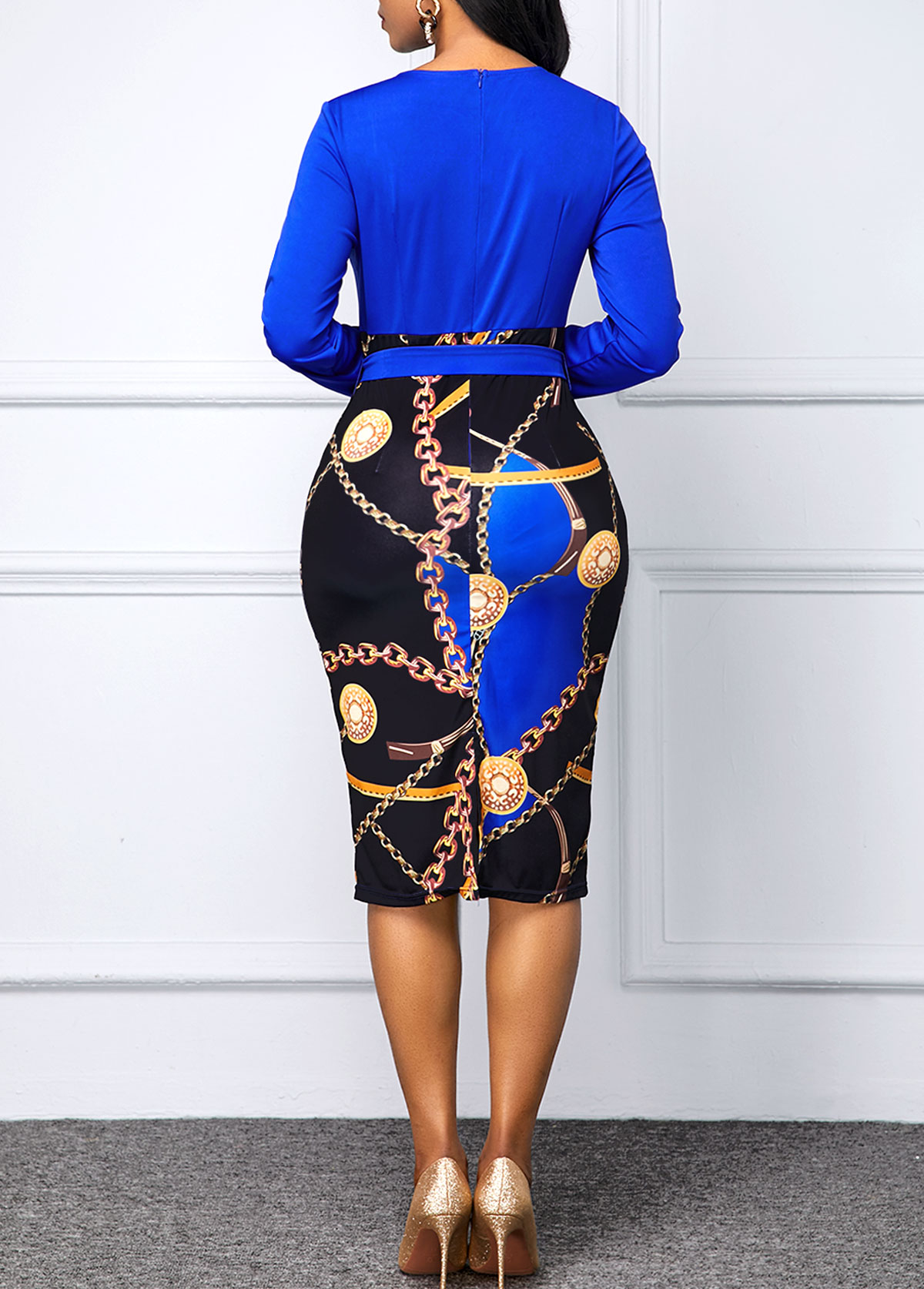 Belted Black V Neck Vary Chain Print Bodycon Dress