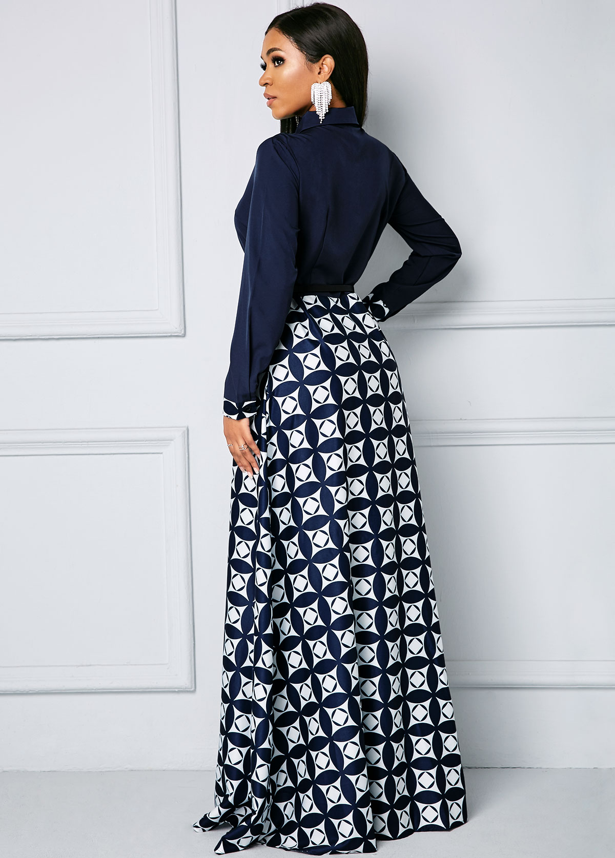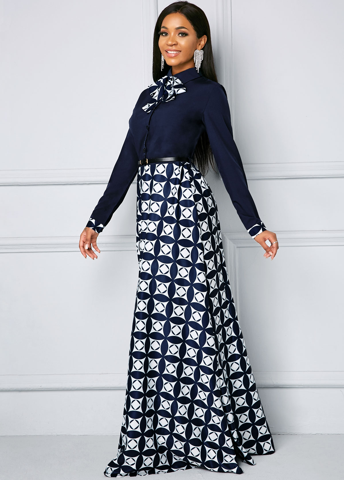 Bowknot Long Sleeve Geometric Print Maxi Dress