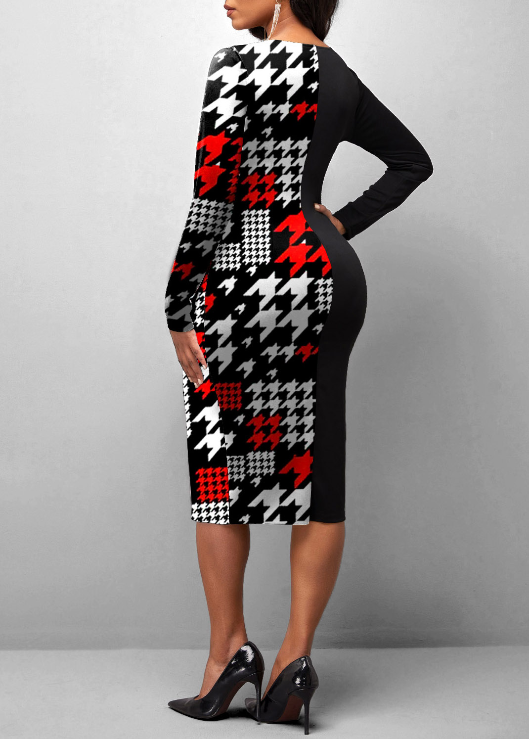 Black Houndstooth Print Long Sleeve Dress