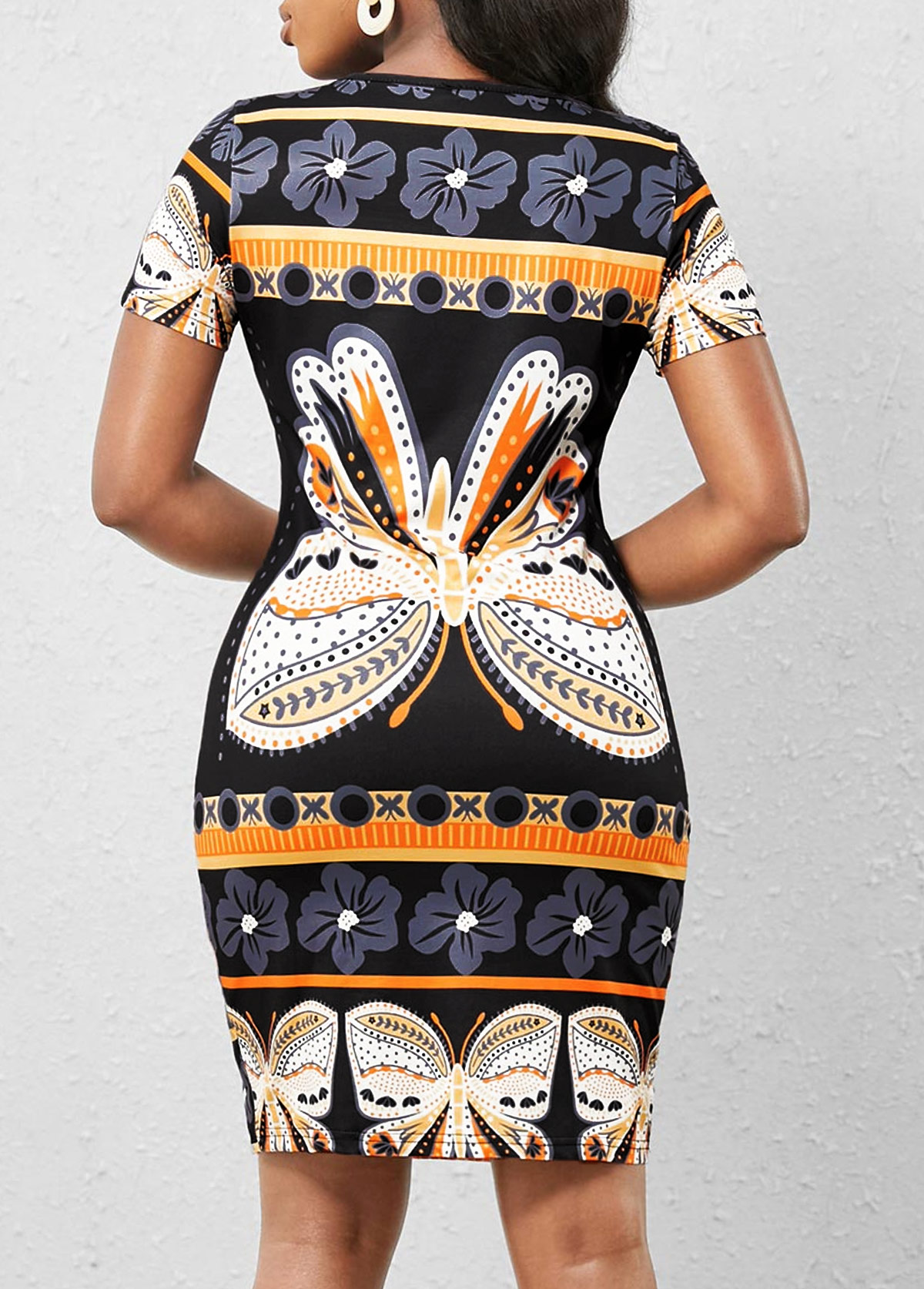 Black Round Neck Butterfly Print Bodycon Dress