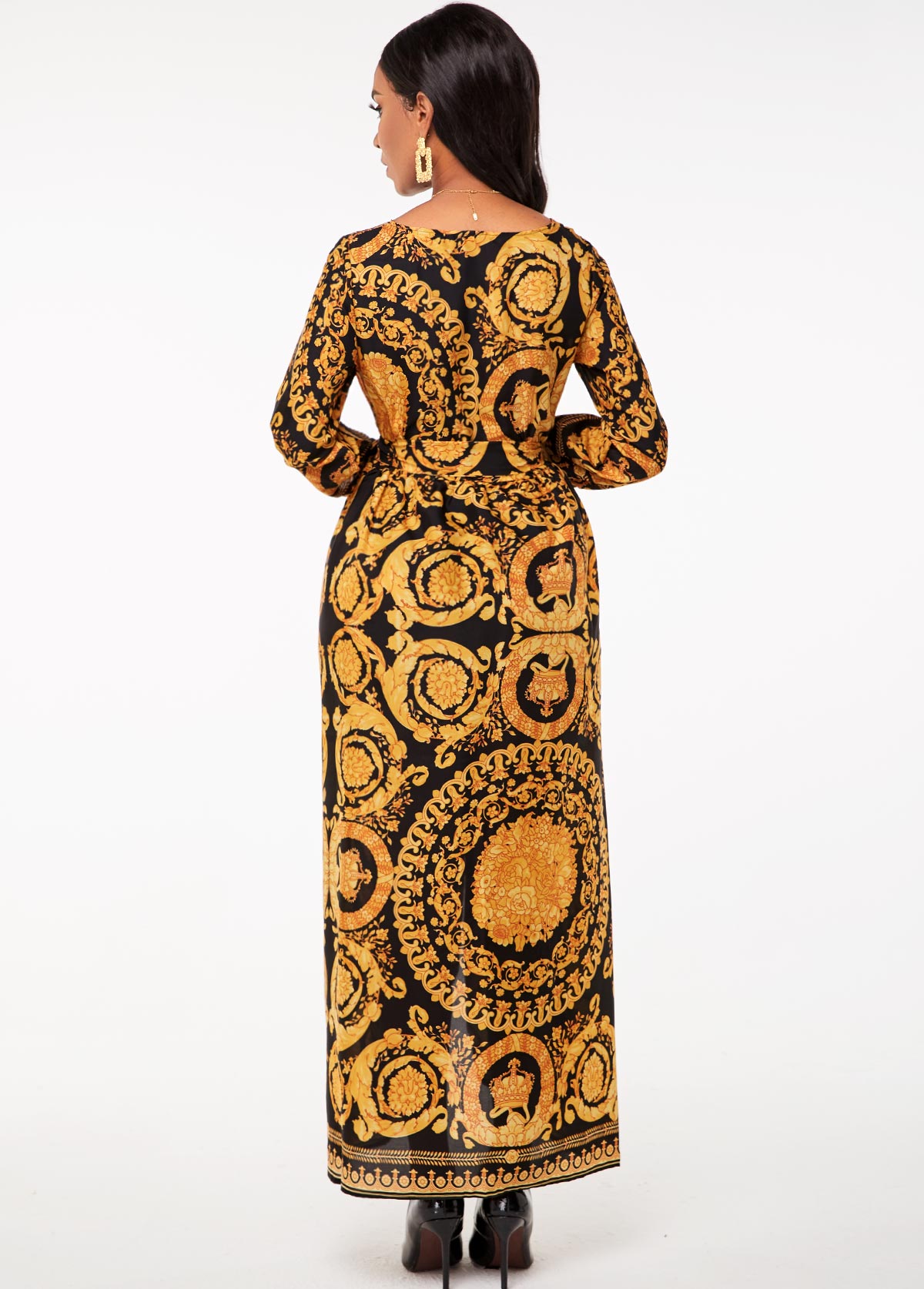 Belted Dashiki Print Bib Neck Maxi Dress