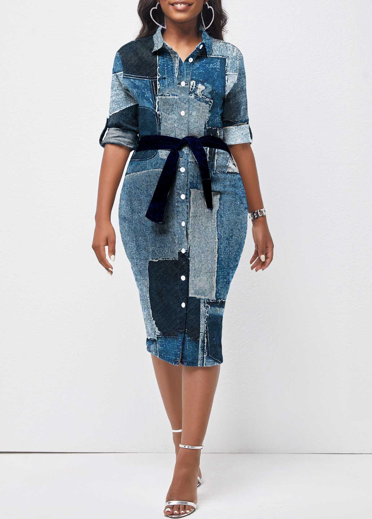 Button Belted Denim Look Print Midi Dress